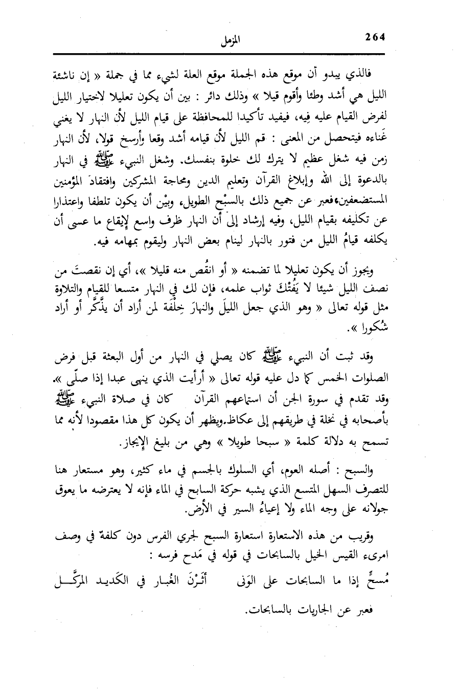 فَالَّذِي يَبْدُو أَنَّ مَوْقِعَ هَذِهِ الْجُمْلَةِ مَوْقِعُ الْعِلَّةِ لِشَيْءٍ مِمَّا فِي جُمْلَةِ إِنَّ ناشِئَةَ اللَّيْلِ هِيَ أَشَدُّ وَطْئاً وَأَقْوَمُ قِيلًا [المزمل: 6] وَذَلِكَ دَائِرٌ: بَيْنَ أَنْ يَكُونَ تَعْلِيلًا لِاخْتِيَارِ اللَّيْلِ لِفَرْضِ الْقِيَامِ عَلَيْهِ فِيهِ، فَيُفِيدُ تَأْكِيدًا لِلْمُحَافَظَةِ عَلَى قِيَامِ اللَّيْلِ لِأَنَّ النَّهَارَ لَا يُغْنِي غَنَاءَهُ فَيَتَحَصَّلُ مِنَ الْمَعْنَى: قُمِ اللَّيْلَ لِأَنَّ قِيَامَهُ أَشَدُّ وَقْعًا وَأَرْسَخُ قَوْلًا، لِأَنَّ النَّهَارَ زَمَنٌ فِيهِ شُغْلٌ عَظِيمٌ لَا يَتْرُكُ لَكَ خَلْوَةً بِنَفْسِكَ. وَشُغْلُ النَّبِيءِ صَلَّى اللهُ عَلَيْهِ وَسَلَّمَ فِي النَّهَارِ بِالدَّعْوَةِ إِلَى اللَّهِ وَإِبْلَاغِ الْقُرْآنِ وَتَعْلِيمِ الدِّينِ وَمُحَاجَّةِ الْمُشْرِكِينَ وَافْتِقَادِ الْمُؤْمِنِينَ الْمُسْتَضْعَفِينَ، فَعَبَّرَ عَنْ جَمِيعِ ذَلِكَ بِالسَّبْحِ الطَّوِيلِ، وَبَيْنَ أَنْ يَكُونَ تَلَطُّفًا وَاعْتِذَارًا عَنْ تَكْلِيفِهِ بِقِيَامِ اللَّيْلِ، وَفِيهِ إِرْشَادٌ إِلَى أَنَّ النَّهَارَ ظَرْفٌ وَاسِعٌ لِإِيقَاعِ مَا عَسَى أَن يكلفه فيام اللَّيْلِ مِنْ فُتُورٍ بِالنَّهَارِ لِيَنَامَ بَعْضَ النَّهَارِ وَلِيَقُومَ بِمَهَامِّهِ فِيهِ.