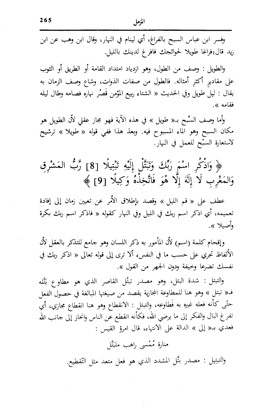 مَنَارَةُ مَمْسَى رَاهِبٍ مُتَبَتِّلِ وَالتَّبْتِيلُ: مَصْدَرُ بَتَّلَ الْمُشَدَّدِ الَّذِي هُوَ فِعْلٌ مُتَعَدٍّ مِثْلَ التَّقْطِيعِ.