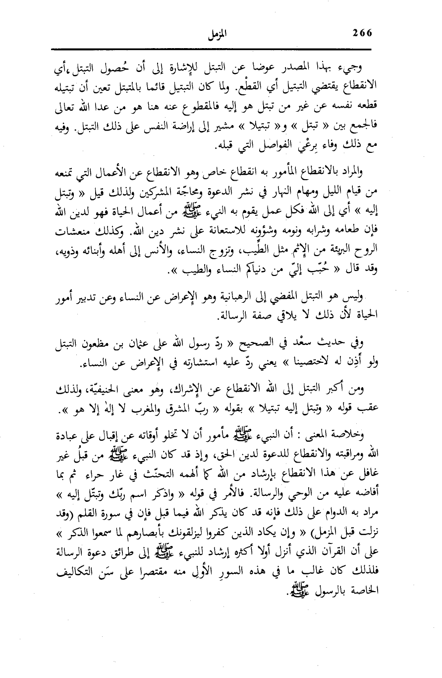 وَالْمُرَادُ بِالِانْقِطَاعِ الْمَأْمُورِ بِهِ انْقِطَاعٌ خَاصٌّ وَهُوَ الِانْقِطَاعُ عَنِ الْأَعْمَالِ الَّتِي تَمْنَعُهُ مِنْ قِيَامِ اللَّيْلِ وَمَهَامِّ النَّهَارِ فِي نَشْرِ الدَّعْوَةِ وَمُحَاجَّةِ الْمُشْرِكِينَ وَلِذَلِكَ قِيلَ وَتَبَتَّلْ إِلَيْهِ أَيْ إِلَى اللَّهِ فَكُلُّ عَمَلٍ يَقُومُ بِهِ النَّبِيءُ صَلَّى اللهُ عَلَيْهِ وَسَلَّمَ مِنْ أَعْمَالِ الْحَيَاةِ فَهُوَ لِدِينِ اللَّهِ فَإِنَّ طَعَامَهُ وَشَرَابه ونومه وشؤونه لِلِاسْتِعَانَةِ عَلَى نَشْرِ دِينِ اللَّهِ. وَكَذَلِكَ مُنْعِشَاتُ الرُّوحِ الْبَرِيئَةِ مِنَ الْإِثْمِ مِثْلَ الطِّيبِ، وَتَزَوُّجِ النِّسَاءِ، وَالْأُنْسِ إِلَى أَهْلِهِ وَأَبْنَائِهِ وَذَوِيهِ، وَقَدْ قَالَ: «حُبِّبَ إِلَيَّ مِنْ دُنْيَاكُمُ النِّسَاءُ وَالطِّيبُ» .
