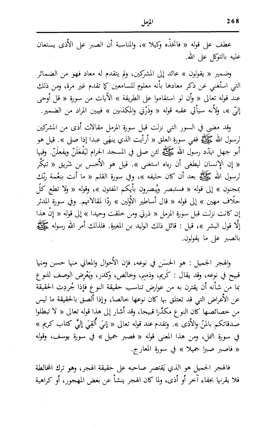 وَقَدْ مَضَى فِي السُّوَرِ الَّتِي نَزَلَتْ قَبْلَ سُورَةِ الْمُزَّمِّلِ مَقَالَاتُ أَذًى مِنَ الْمُشْرِكِينَ لِرَسُولِ اللَّهِ صَلَّى اللهُ عَلَيْهِ وَسَلَّمَ فَفِي سُورَةِ الْعَلَقِ [9، 10] أَرَأَيْتَ الَّذِي يَنْهى عَبْداً إِذا صَلَّى. قِيلَ هُوَ أَبُو جَهْلٍ تَهَدَّدَ رَسُولَ اللَّهِ صَلَّى اللهُ عَلَيْهِ وَسَلَّمَ لَئِنْ صَلَّى فِي الْمَسْجِدِ الْحَرَامِ لَيَفْعَلَنَّ وَيَفْعَلَنَّ. وَفِيهَا: إِنَّ الْإِنْسانَ لَيَطْغى أَنْ رَآهُ اسْتَغْنى [العلق: 6، 7] . قِيلَ هُوَ الْأَخْنَسُ بْنُ شُرَيْقٍ «تَنَكَّرَ لِرَسُولِ اللَّهِ صَلَّى اللهُ عَلَيْهِ وَسَلَّمَ بَعْدَ أَنْ كَانَ حَلِيفَهُ» ، وَفِي سُورَةِ الْقَلَمِ [2- 15] مَا أَنْتَ بِنِعْمَةِ رَبِّكَ بِمَجْنُونٍ إِلَى قَوْلِهِ: فَسَتُبْصِرُ وَيُبْصِرُونَ بِأَيِّكُمُ الْمَفْتُونُ، وَقَوْلِهِ: وَلا تُطِعْ كُلَّ حَلَّافٍ مَهِينٍ إِلَى قَوْلِهِ: قالَ أَساطِيرُ الْأَوَّلِينَ [الْقَلَم: 15] رَدًّا لِمَقَالَاتِهِمْ. وَفِي سُورَةِ الْمُدَّثِّرِ [11- 25] إِنْ كَانَتْ نَزَلَتْ قَبْلَ سُورَةِ الْمُزَّمِّلِ ذَرْنِي وَمَنْ خَلَقْتُ وَحِيداً إِلَى قَوْلِهِ: إِنْ هَذَا إِلَّا قَوْلُ الْبَشَرِ، قِيلَ: قَائِلُ ذَلِكَ الْوَلِيدُ بْنُ الْمُغِيرَةِ. فَلِذَلِكَ أَمَرَ اللَّهُ رَسُولَهُ صَلَّى اللهُ عَلَيْهِ وَسَلَّمَ بِالصَّبْرِ عَلَى مَا يَقُولُونَ.
