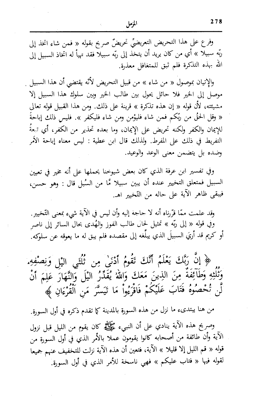 إِنَّ رَبَّكَ يَعْلَمُ أَنَّكَ تَقُومُ أَدْنى مِنْ ثُلُثَيِ اللَّيْلِ وَنِصْفَهُ وَثُلُثَهُ وَطائِفَةٌ مِنَ الَّذِينَ مَعَكَ وَاللَّهُ يُقَدِّرُ اللَّيْلَ وَالنَّهارَ عَلِمَ أَنْ لَنْ تُحْصُوهُ فَتابَ عَلَيْكُمْ فَاقْرَؤُا مَا تَيَسَّرَ مِنَ الْقُرْآنِ.