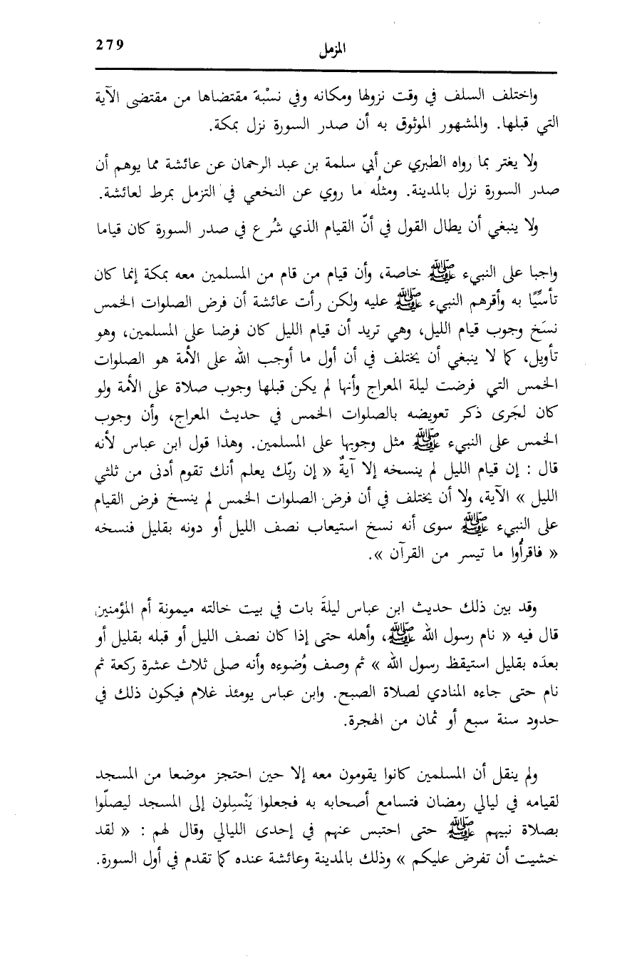 وَلَا يَنْبَغِي أَنْ يُطَالَ الْقَوْلُ فِي أَنَّ الْقِيَامَ الَّذِي شُرِّعَ فِي صَدْرِ السُّورَةِ كَانَ قِيَامًا وَاجِبًا عَلَى النَّبِيءِ صَلَّى اللهُ عَلَيْهِ وَسَلَّمَ خَاصَّةً، وَأَنَّ قِيَامَ مَنْ قَامَ مِنَ الْمُسْلِمِينَ مَعَهُ بِمَكَّةَ إِنَّمَا كَانَ تَأَسِّيًا بِهِ وَأَقَرَّهُمُ النَّبِيءُ صَلَّى اللهُ عَلَيْهِ وَسَلَّمَ عَلَيْهِ وَلَكِنْ رَأَتْ عَائِشَةُ أَنَّ فَرْضَ الصَّلَوَاتِ الْخَمْسِ نَسَخَ وُجُوبَ قِيَامِ اللَّيْلِ، وَهِيَ تُرِيدُ أَنَّ قِيَامَ اللَّيْلِ كَانَ فَرْضًا عَلَى الْمُسْلِمِينَ، وَهُوَ تَأْوِيلٌ، كَمَا لَا يَنْبَغِي أَنْ يُخْتَلَفَ فِي أَنَّ أَوَّلَ مَا أَوْجَبَ اللَّهُ عَلَى الْأُمَّةِ هُوَ الصَّلَوَاتُ الْخَمْسُ الَّتِي فُرِضَتْ لَيْلَةَ الْمِعْرَاجِ وَأَنَّهَا لَمْ يَكُنْ قَبْلَهَا وُجُوبُ صَلَاةٍ عَلَى الْأُمَّةِ وَلَوْ كَانَ لجرى ذكر تعويضه بِالصَّلَوَاتِ الْخَمْسِ فِي حَدِيثِ الْمِعْرَاجِ، وَأَنَّ جوب الْخَمْسِ عَلَى النَّبِيءِ صَلَّى اللهُ عَلَيْهِ وَسَلَّمَ مِثْلَ وُجُوبِهَا عَلَى الْمُسْلِمِينَ. وَهَذَا قَوْلُ ابْنِ عَبَّاسٍ لِأَنَّهُ قَالَ: إِنَّ قِيَامَ اللَّيْلِ لَمْ يَنْسَخْهُ إِلَّا آيَةُ: إِنَّ رَبَّكَ يَعْلَمُ أَنَّكَ تَقُومُ أَدْنى مِنْ ثُلُثَيِ اللَّيْلِ الْآيَةَ، وَلَا أَنْ يُخْتَلَفَ فِي أَنَّ فَرْضَ الصَّلَوَاتِ الْخَمْسِ لَمْ يَنْسَخْ فَرْضَ الْقِيَامِ عَلَى النَّبِيءِ صَلَّى اللهُ عَلَيْهِ وَسَلَّمَ سِوَى أَنَّهُ نَسْخُ اسْتِيعَابِ نِصْفِ اللَّيْلِ أَوْ دُونَهُ بِقَلِيل فنسخه فَاقْرَؤُا مَا تَيَسَّرَ مِنَ الْقُرْآنِ.
