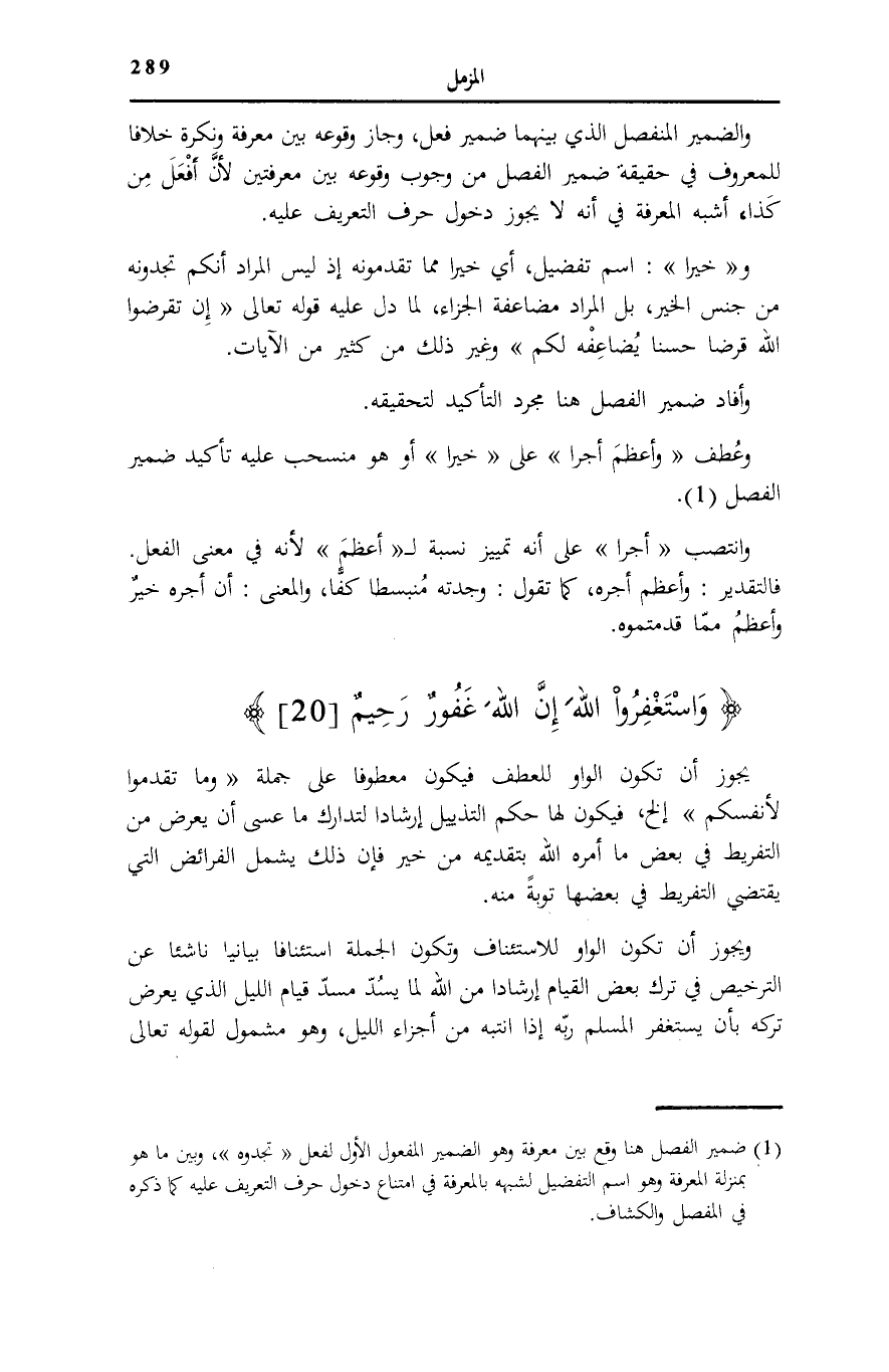 (¬1) ضمير الْفَصْل هُنَا وَقع بَين معرفَة وَهُوَ الضَّمِير الْمَفْعُول الأول لفعل «تَجِدُوهُ» ، وَبَين مَا هُوَ بِمَنْزِلَة الْمعرفَة وَهُوَ اسْم التَّفْضِيل لشبهه بالمعرفة فِي امْتنَاع دُخُول حرف التَّعْرِيف عَلَيْهِ كَمَا ذكره فِي «الْمفصل» «والكشاف» .