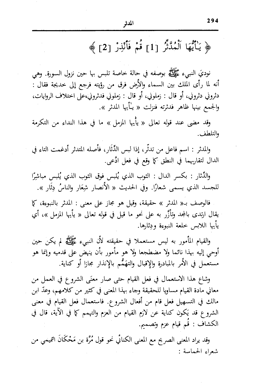 . فَالْوَصْفُ بِ الْمُدَّثِّرُ حَقِيقَةٌ، وَقِيلَ هُوَ مَجَازٌ عَلَى مَعْنَى: الْمُدَّثِّرُ بِالنُّبُوءَةِ، كَمَا يُقَالُ: ارْتَدَى بِالْمَجْدِ وَتَأَزَّرَ بِهِ عَلَى نَحْوِ مَا قِيلَ فِي قَوْلِهِ تَعَالَى: يَا أَيُّهَا الْمُزَّمِّلُ، أَيْ يَا أَيُّهَا اللَّابِسُ خُلْعَةَ النُّبُوءَةِ وَدِثَارَهَا.