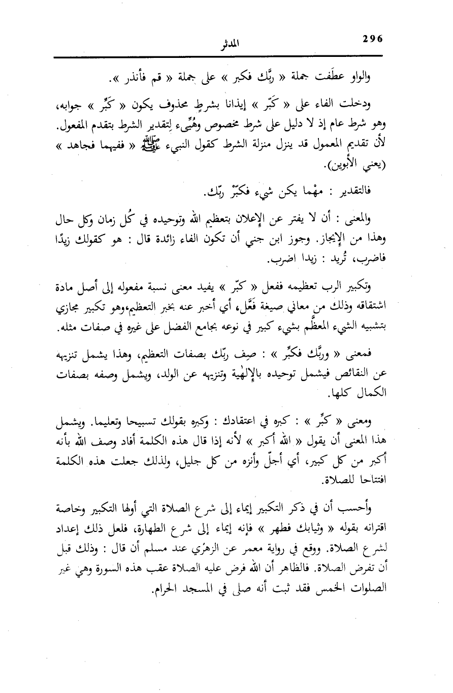 وَأَحْسَبُ أَنَّ فِي ذِكْرِ التَّكْبِيرِ إِيمَاءً إِلَى شَرْعِ الصَّلَاةِ الَّتِي أَوَّلُهَا التَّكْبِيرُ وَخَاصَّةً اقْتِرَانُهُ بِقَوْلِهِ: وَثِيابَكَ فَطَهِّرْ [المدثر: 4] فَإِنَّهُ إِيمَاءٌ إِلَى شَرْعِ الطَّهَارَةِ، فَلَعَلَّ ذَلِكَ إِعْدَادٌ لِشَرْعِ الصَّلَاةِ. وَوَقَعَ فِي رِوَايَةِ مَعْمَرٍ عَنِ الزُّهْرِيِّ عِنْدَ مُسْلِمٍ أَنْ قَالَ: وَذَلِكَ قَبْلَ أَنْ تُفْرَضَ الصَّلَاةُ. فَالظَّاهِرُ أَنَّ اللَّهَ فَرَضَ عَلَيْهِ الصَّلَاةَ عَقِبَ هَذِهِ السُّورَةِ وَهِيَ غَيْرُ الصَّلَوَاتِ الْخَمْسِ فَقَدْ ثَبَتَ أَنَّهُ صَلَّى فِي الْمَسْجِد الْحَرَام.