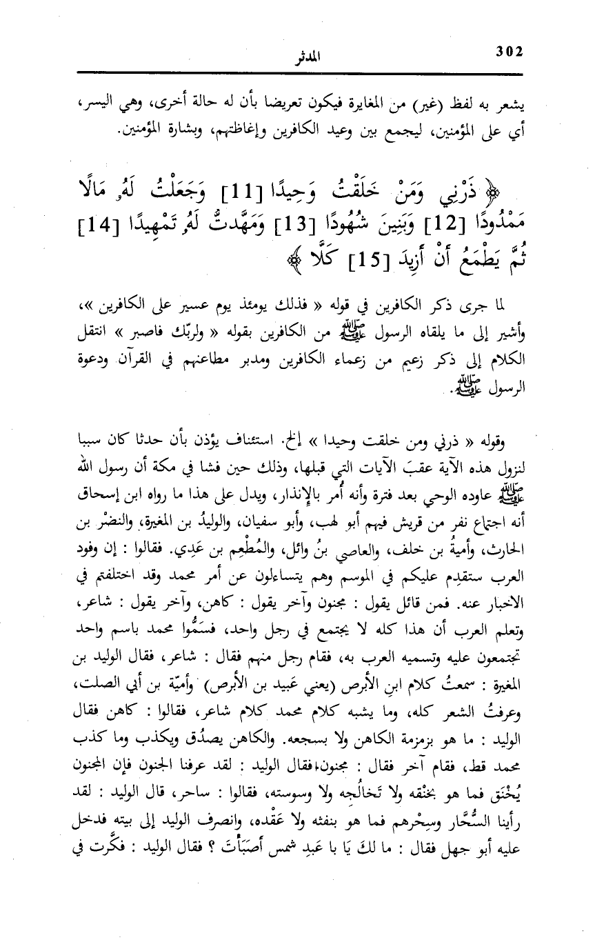 9، 10] ، وَأُشِيرُ إِلَى مَا يَلْقَاهُ الرَّسُولُ صَلَّى اللهُ عَلَيْهِ وَسَلَّمَ مِنَ الْكَافِرِينَ بِقَوْلِهِ: وَلِرَبِّكَ فَاصْبِرْ [المدثر: 7] انْتَقَلَ الْكَلَامُ إِلَى ذِكْرِ زَعِيمٍ مِنْ زُعَمَاءِ الْكَافِرِينَ وَمُدَبِّرِ مَطَاعِنِهِمْ فِي الْقُرْآنِ وَدَعْوَةِ الرَّسُولِ صَلَّى اللهُ عَلَيْهِ وَسَلَّمَ.