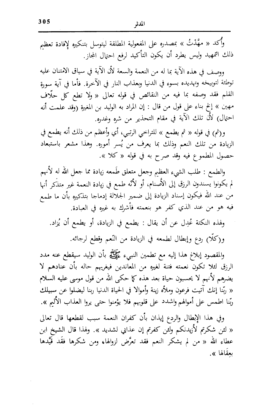 الزِّيَادَةِ مِنْ تِلْكَ النِّعَمِ وَذَلِكَ بِمَا يُعْرَفُ مِنْ يُسْرِ أُمُورِهِ. وَهَذَا مُشْعِرٌ بِاسْتِبْعَادِ حُصُولِ الْمَطْمُوعِ فِيهِ وَقَدْ صَرَّحَ بِهِ فِي قَوْلِهِ: كَلَّا.
