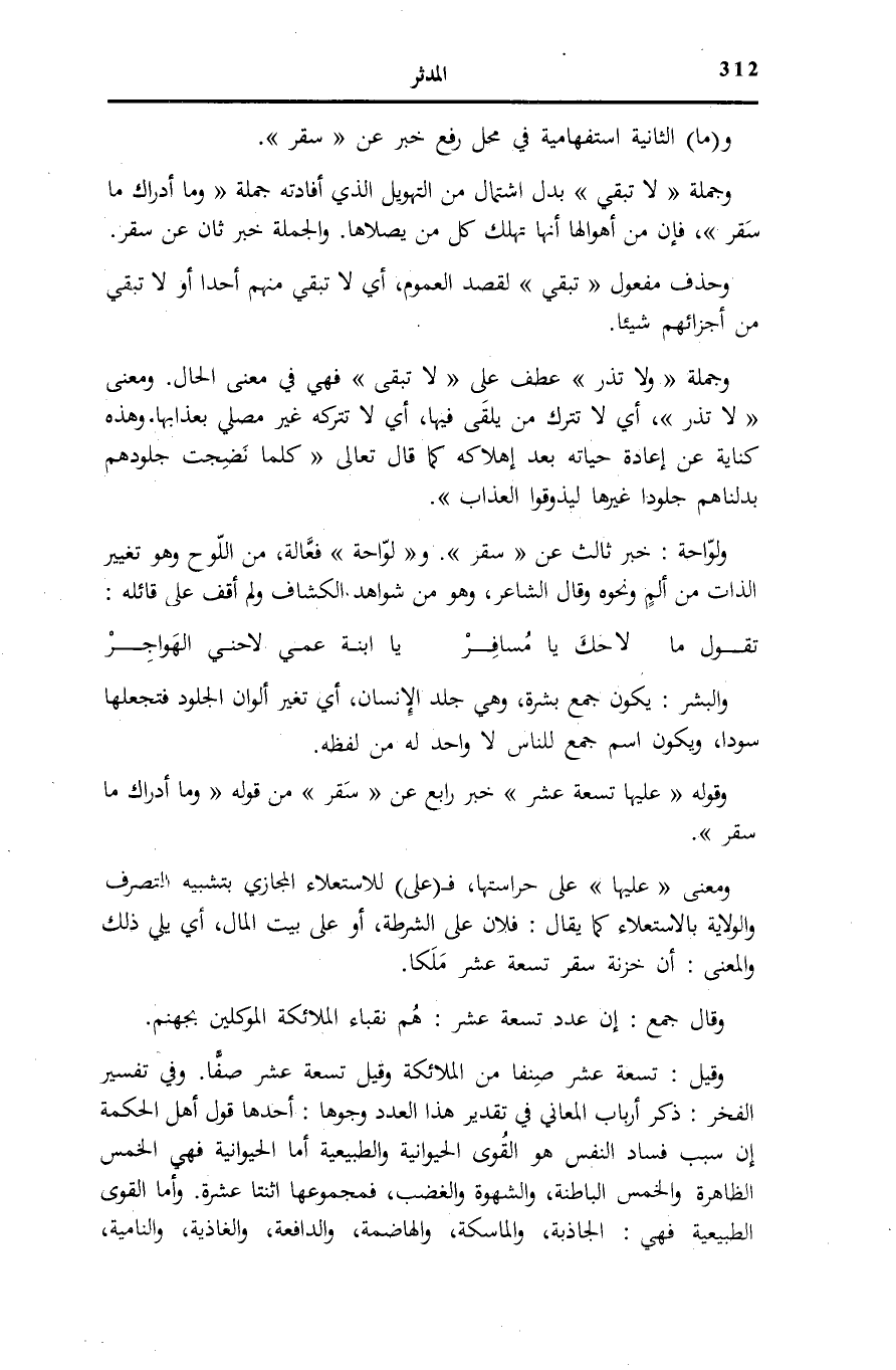 وَقَوْلُهُ: عَلَيْها تِسْعَةَ عَشَرَ خَبَرٌ رَابِعٌ عَنْ سَقَرُ مِنْ قَوْلِهِ: وَما أَدْراكَ مَا سَقَرُ.
