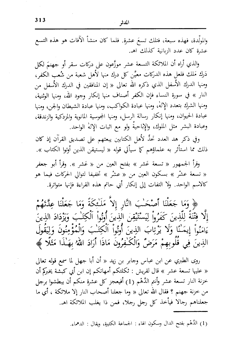 وَما جَعَلْنا أَصْحابَ النَّارِ إِلاَّ مَلائِكَةً وَما جَعَلْنا عِدَّتَهُمْ إِلاَّ فِتْنَةً لِلَّذِينَ كَفَرُوا لِيَسْتَيْقِنَ الَّذِينَ أُوتُوا الْكِتابَ وَيَزْدادَ الَّذِينَ آمَنُوا إِيماناً وَلا يَرْتابَ الَّذِينَ أُوتُوا الْكِتابَ وَالْمُؤْمِنُونَ وَلِيَقُولَ الَّذِينَ فِي قُلُوبِهِمْ مَرَضٌ وَالْكافِرُونَ مَاذَا أَرادَ اللَّهُ بِهذا مَثَلاً كَذلِكَ يُضِلُّ اللَّهُ مَنْ يَشاءُ وَيَهْدِي مَنْ يَشاءُ وَما يَعْلَمُ جُنُودَ رَبِّكَ إِلاَّ هُوَ وَما هِيَ إِلاَّ ذِكْرى لِلْبَشَرِ (31)