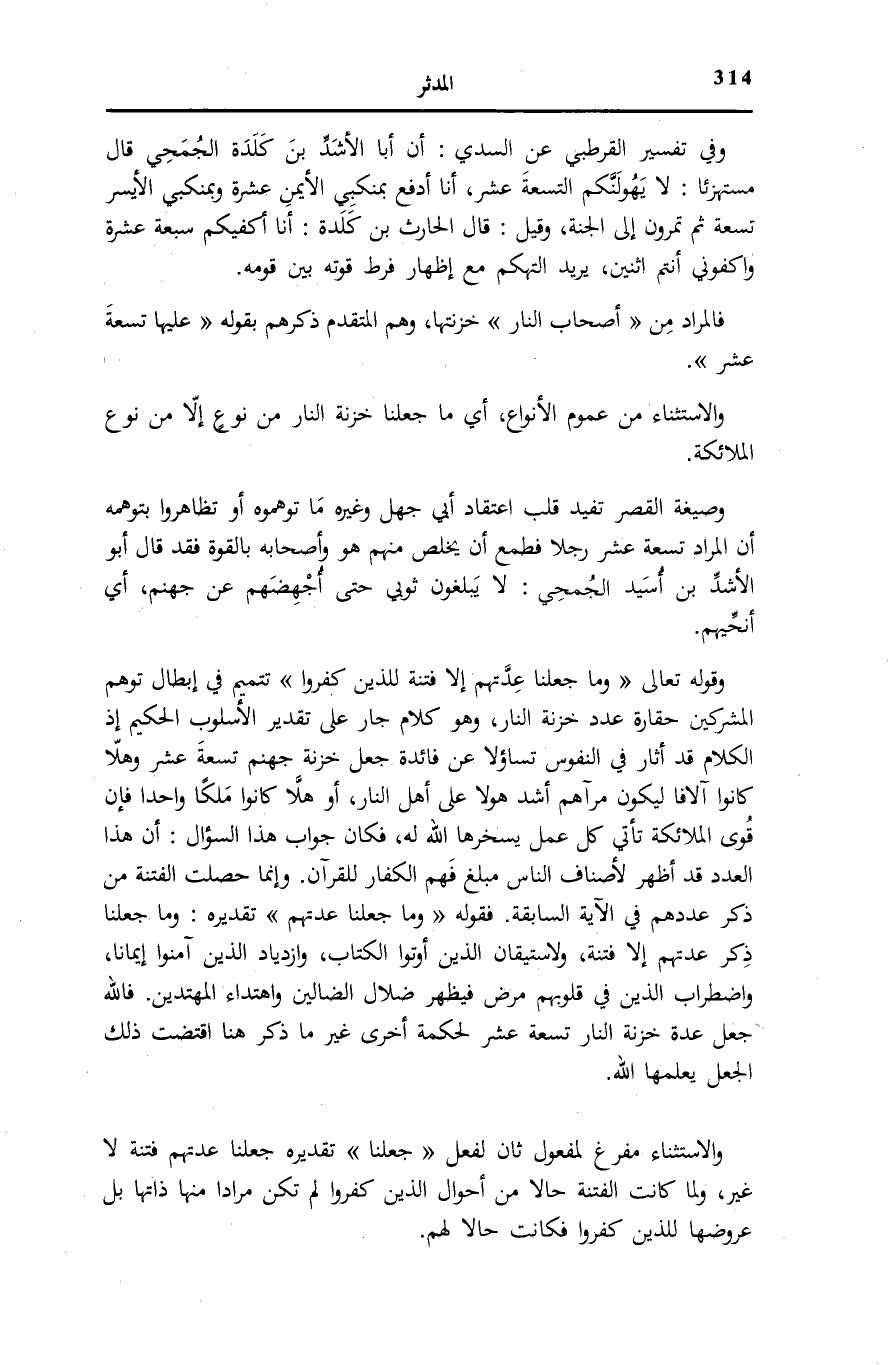وَما جَعَلْنا عِدَّتَهُمْ تَقْدِيرُهُ: وَمَا جَعَلْنَا ذِكْرَ عِدَّتِهِمْ إِلَّا فِتْنَةً، وَلِاسْتِيقَانِ الَّذِينَ أُوتُوا الْكِتَابَ، وَازْدِيَادِ الَّذِينَ آمَنُوا إِيمَانًا، وَاضْطِرَابِ الَّذِينَ فِي قُلُوبِهِمْ مَرَضٌ فَيَظْهَرُ ضَلَالُ الضَّالِّينَ وَاهْتِدَاءُ الْمُهْتَدِينَ. فَاللَّهُ جَعَلَ عِدَّةَ خَزَنَةِ النَّارِ تِسْعَةَ عَشَرَ لِحِكْمَةٍ أُخْرَى غَيْرِ مَا ذُكِرَ هُنَا اقْتَضَتْ ذَلِكَ الْجَعْلَ يَعْلَمُهَا الله.