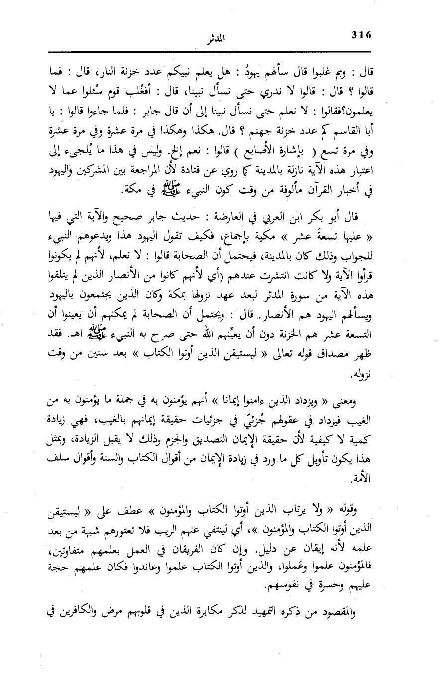 قَالَ أَبُو بَكْرِ ابْن الْعَرَبِيِّ فِي «الْعَارِضَةِ» : حَدِيثُ جَابِرٍ صَحِيحٌ وَالْآيَةُ الَّتِي فِيهَا عَلَيْها تِسْعَةَ عَشَرَ [المدثر: 30] مَكِّيَّةٌ بِإِجْمَاعٍ، فَكَيْفَ تَقُولُ الْيَهُودُ هَذَا وَيَدْعُوهُمُ النَّبِيءُ لِلْجَوَابِ وَذَلِكَ كَانَ بِالْمَدِينَةِ، فَيَحْتَمِلُ أَنَّ الصَّحَابَةَ قَالُوا: لَا نَعْلَمُ، لِأَنَّهُمْ لم يَكُونُوا قرأوا الْآيَةَ وَلَا كَانَتِ انْتَشَرَتْ عِنْدَهُمْ (أَيْ لِأَنَّهُمْ كَانُوا مِنَ الْأَنْصَارِ الَّذِينَ لَمْ يَتَلَقَّوْا هَذِهِ الْآيَةَ مِنْ سُورَةِ الْمُدَّثِّرِ لِبُعْدِ عَهْدِ نُزُولِهَا بِمَكَّةَ وَكَانَ الَّذِينَ يَجْتَمِعُونَ بِالْيَهُودِ وَيَسْأَلُهُمُ الْيَهُودُ هُمُ الْأَنْصَارُ.