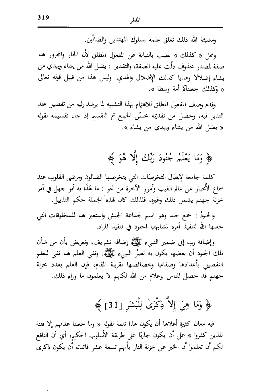 وَإِضَافَةُ رَبٍّ إِلَى ضَمِيرِ النَّبِيءِ صَلَّى اللهُ عَلَيْهِ وَسَلَّمَ إِضَافَةُ تَشْرِيفٍ، وَتَعْرِيضٍ بِأَنَّ مِنْ شَأْنِ تِلْكَ الْجُنُودِ أَنَّ بَعْضَهَا يَكُونُ بِهِ نَصْرُ النَّبِيءِ صَلَّى اللهُ عَلَيْهِ وَسَلَّمَ. وَنَفْيُ الْعِلْمِ هُنَا نَفْيٌ لِلْعِلْمِ التَّفْصِيلِيِّ بِأَعْدَادِهَا وَصِفَاتِهَا وَخَصَائِصِهَا بِقَرِينَةِ الْمَقَامِ، فَإِنَّ الْعِلْمَ بِعَدَدِ خَزَنَةِ جَهَنَّمَ قَدْ حَصَلَ لِلنَّاسِ بِإِعْلَامٍ مِنَ اللَّهِ لَكِنَّهُمْ لَا يَعْلَمُونَ مَا وَرَاءَ ذَلِكَ.