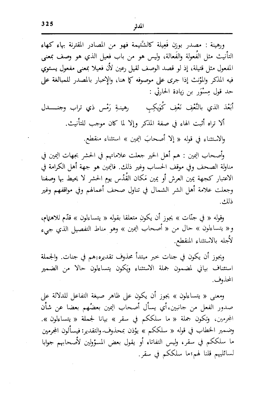 وَالِاسْتِثْنَاءُ فِي قَوْلِهِ: إِلَّا أَصْحابَ الْيَمِينِ اسْتِثْنَاءٌ مُنْقَطِعٌ.