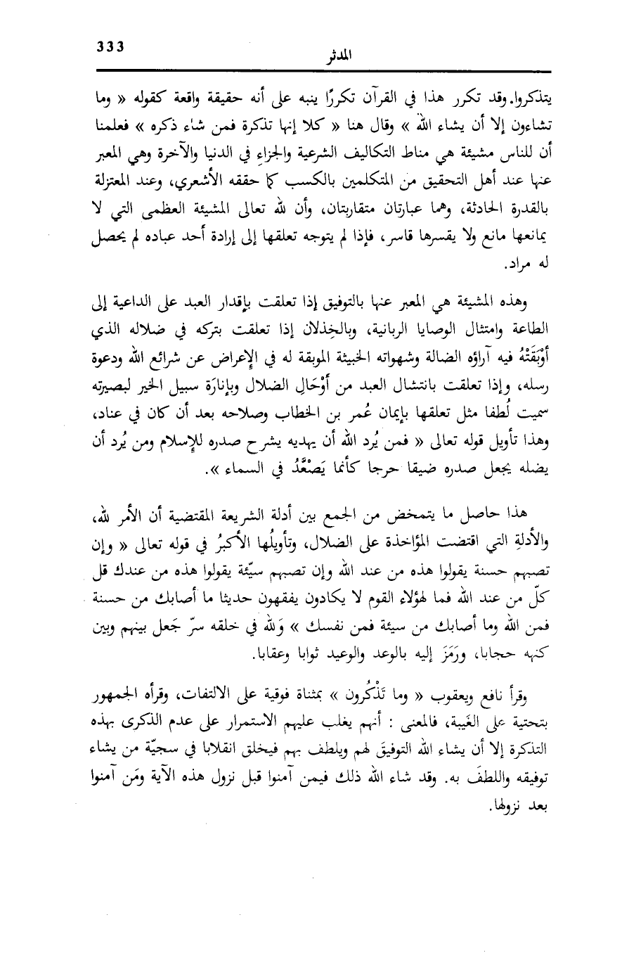 يَتَذَكَّرُوا، وَقَدْ تَكَرَّرَ هَذَا فِي الْقُرْآنِ تَكَرُّرًا يُنَبِّهُ عَلَى أَنَّهُ حَقِيقَةٌ وَاقِعَةٌ كَقَوْلِه: وَما تَشاؤُنَ إِلَّا أَنْ يَشاءَ اللَّهُ [التكوير: 29] وَقَالَ هُنَا كَلَّا إِنَّهُ تَذْكِرَةٌ فَمَنْ شاءَ ذَكَرَهُ فَعَلِمْنَا أَنَّ لِلنَّاسِ مَشِيئَةً هِيَ مَنَاطُ التَّكَالِيفِ الشَّرْعِيَّةِ وَالْجَزَاءِ فِي الدُّنْيَا وَالْآخِرَةِ وَهِيَ الْمُعَبَّرُ عَنْهَا عِنْدَ أَهْلِ التَّحْقِيقِ مِنَ الْمُتَكَلِّمِينَ بِالْكَسْبِ كَمَا حَقَّقَهُ الْأَشْعَرِيُّ، وَعِنْدَ الْمُعْتَزِلَةِ بِالْقُدْرَةِ الْحَادِثَةِ، وَهُمَا عِبَارَتَانِ مُتَقَارِبَتَانِ، وَأَنَّ لِلَّهِ تَعَالَى الْمَشِيئَةَ الْعُظْمَى الَّتِي لَا يُمَانِعُهَا مَانِعٌ وَلَا يَقْسِرُهَا قَاسِرٌ، فَإِذَا لَمْ يَتَوَجَّهْ تَعَلُّقُهَا إِلَى إِرَادَةِ أَحَدِ عِبَادِهِ لَمْ يَحْصُلْ لَهُ مُرَادٌ.