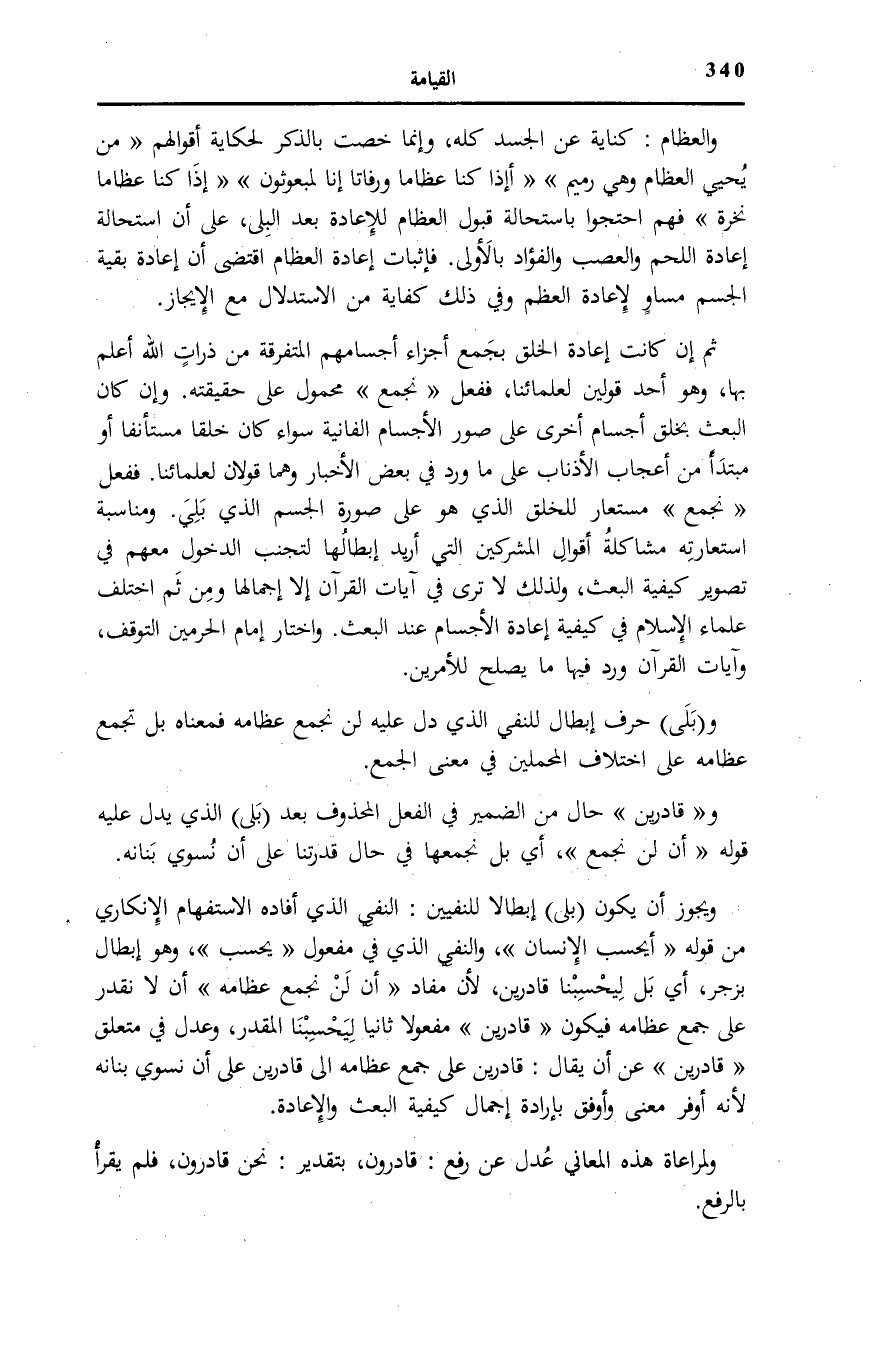 وبَلى حَرْفُ إِبْطَالٍ لِلنَّفْيِ الَّذِي دلّ عَلَيْهِ أَلَّنْ نَجْمَعَ عِظامَهُ فَمَعْنَاهُ بَلْ تُجْمَعُ عِظَامُهُ عَلَى اخْتِلَافِ الْمَحْمَلَيْنِ فِي مَعْنَى الْجَمْعِ.