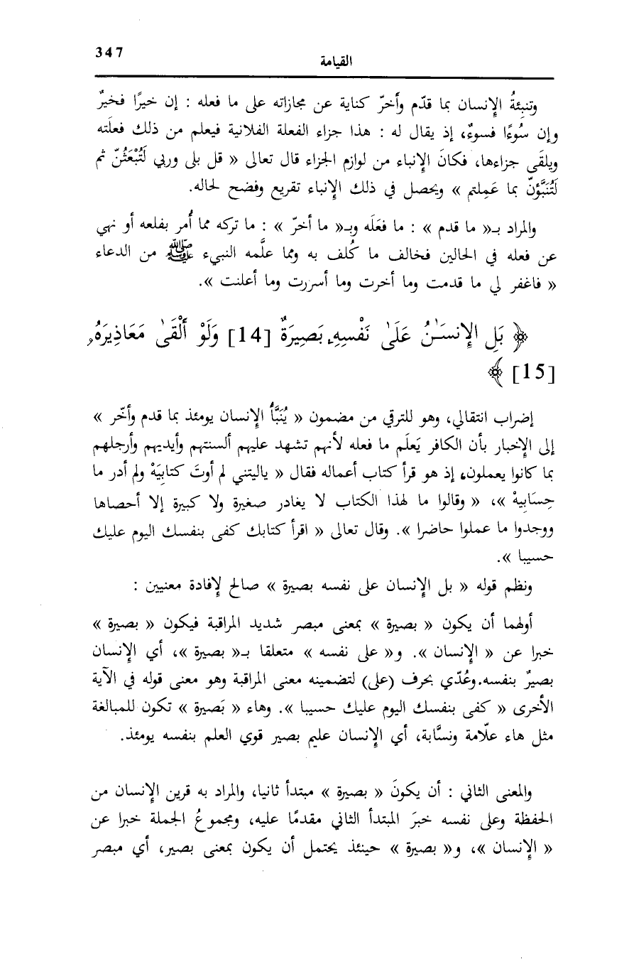 وَنَظْمُ قَوْلِهِ: بَلِ الْإِنْسانُ عَلى نَفْسِهِ بَصِيرَةٌ