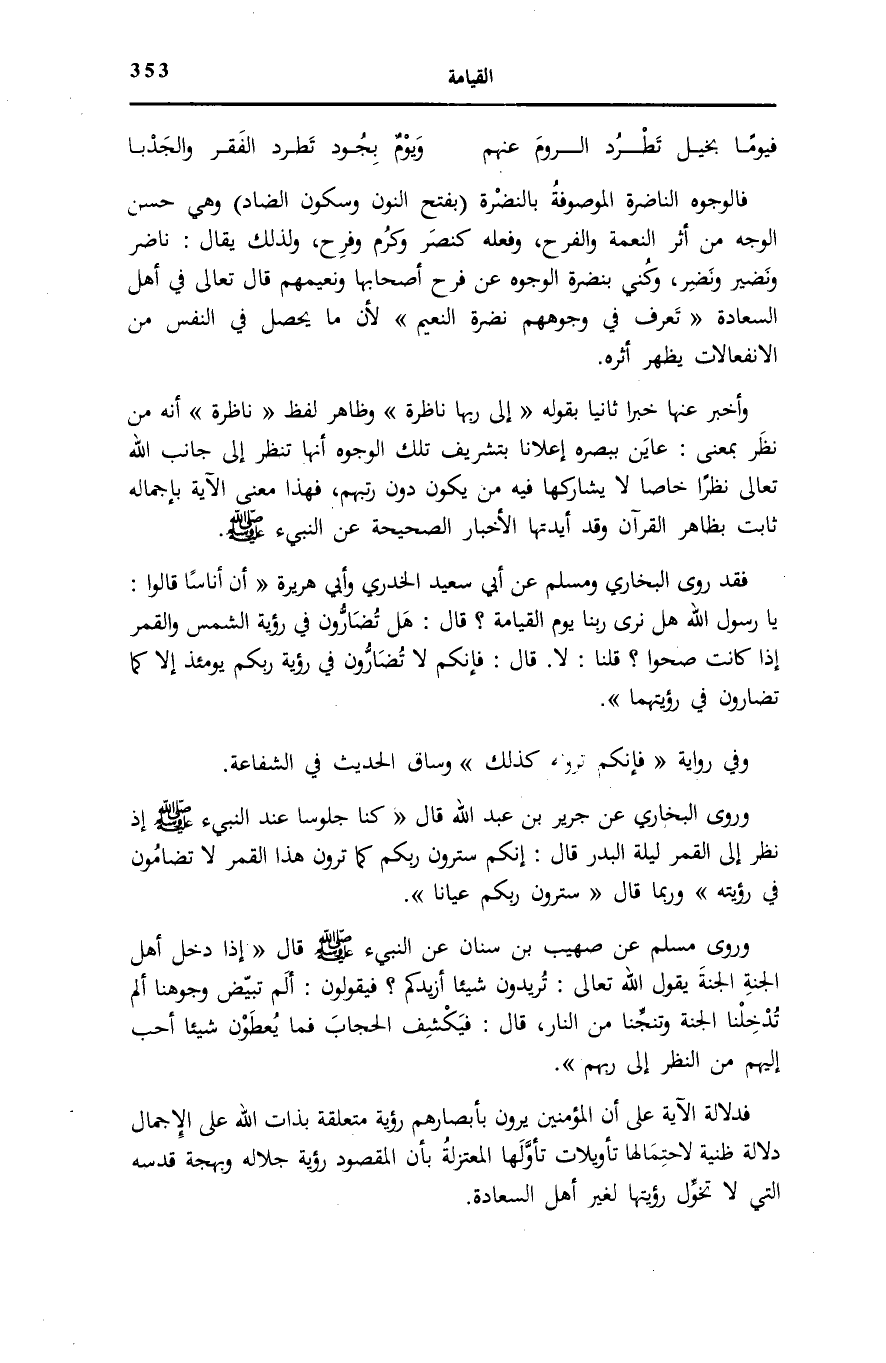 وَرَوَى الْبُخَارِيُّ عَنْ جَرِيرِ بْنِ عَبْدِ اللَّهِ قَالَ: «كُنَّا جُلُوسًا عِنْدَ النَّبِيءِ صَلَّى اللهُ عَلَيْهِ وَسَلَّمَ إِذْ نَظَرَ إِلَى الْقَمَرِ لَيْلَةَ الْبَدْرِ قَالَ: إِنَّكُمْ سَتَرَوْنَ رَبَّكُمْ كَمَا تَرَوْنَ هَذَا الْقَمَرَ لَا تُضَامُونَ فِي رُؤْيَتِهِ» وَرُبَّمَا قَالَ: «سَتَرَوْنَ رَبَّكُمْ عِيَانًا» .