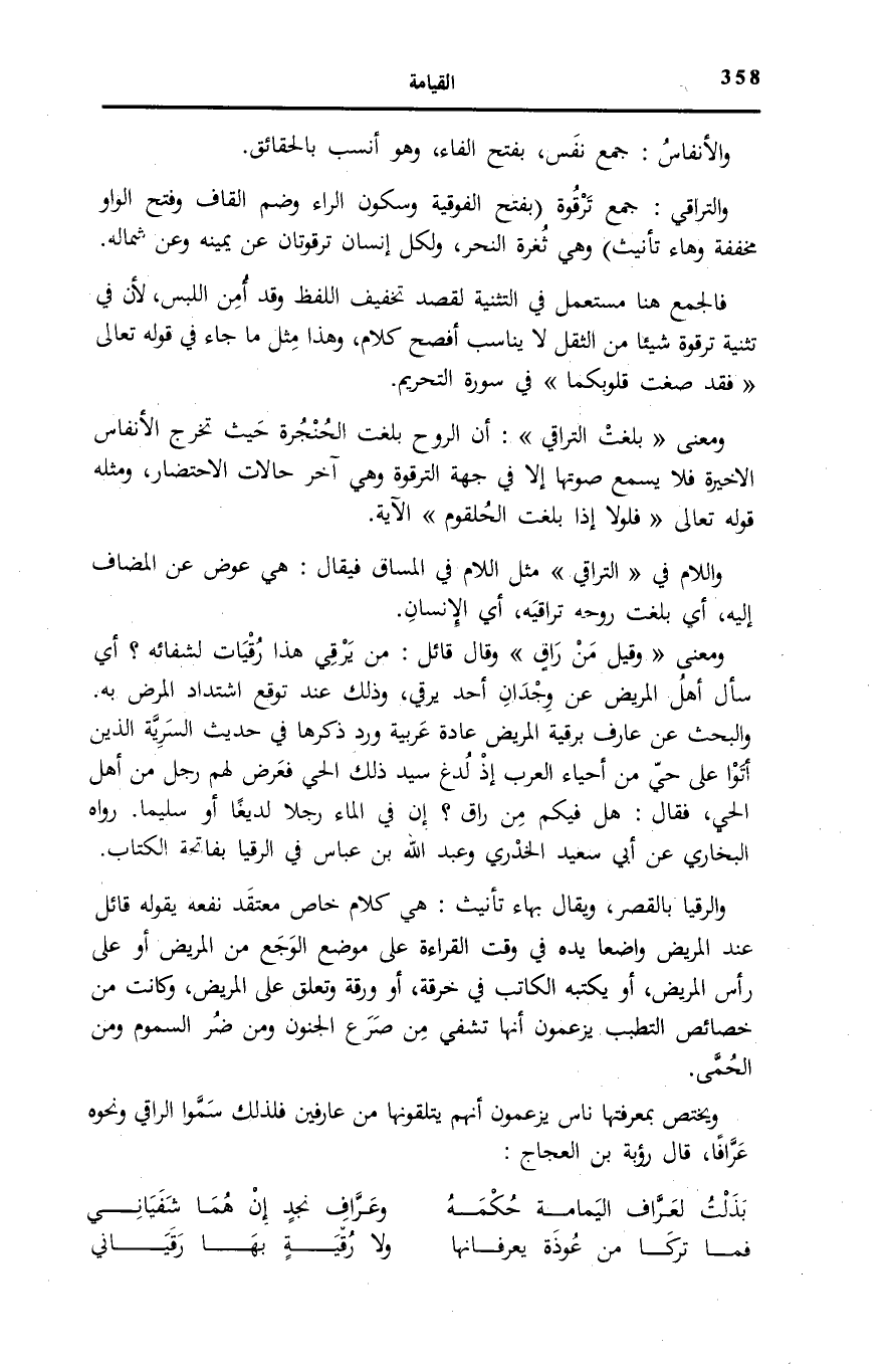 وَاللَّامُ فِي التَّراقِيَ مِثْلُ اللَّامِ فِي الْمَسَاقُ فَيُقَالُ: هِيَ عِوَضٌ عَنِ الْمُضَافِ إِلَيْهِ، أَيْ بَلَغَتْ رُوحُهُ تَرَاقِيَهُ، أَيِ الْإِنْسَانِ.