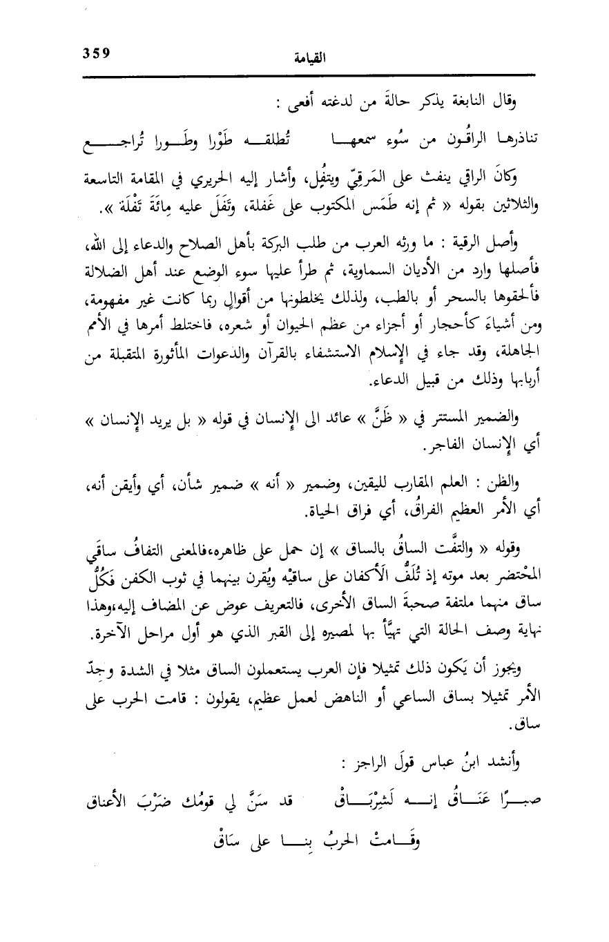 وَقَوْلُهُ: وَالْتَفَّتِ السَّاقُ بِالسَّاقِ إِنْ حُمِلَ عَلَى ظَاهِرِهِ، فَالْمَعْنَى الْتِفَافُ سَاقَيِ الْمُحْتَضِرِ بَعْدَ مَوْتِهِ إِذْ تُلَفُّ الْأَكْفَانُ عَلَى سَاقَيْهِ وَيُقْرَنُ بَيْنَهُمَا فِي ثَوْبِ الْكَفَنِ فَكُلُّ سَاقٍ مِنْهُمَا مُلْتَفَّةٌ صُحْبَةَ السَّاقِ الْأُخْرَى، فَالتَّعْرِيفُ عِوَضٌ عَنِ الْمُضَافِ إِلَيْهِ، وَهَذَا نِهَايَةُ وَصْفِ الْحَالَةِ الَّتِي تَهَيَّأَ بِهَا لِمَصِيرِهِ إِلَى الْقَبْرِ الَّذِي هُوَ أَوَّلُ مَرَاحِلِ الْآخِرَةِ.