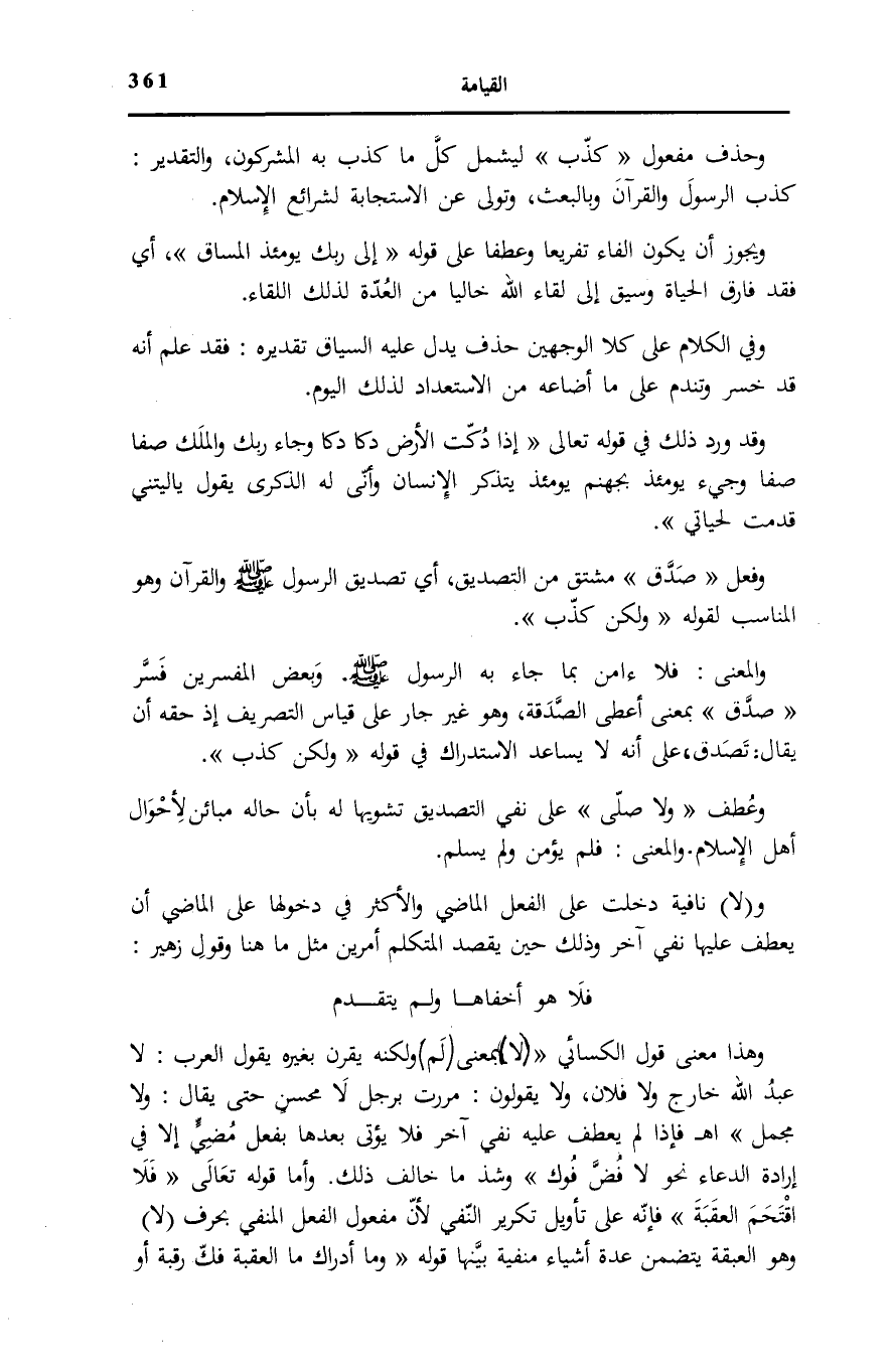 وَالْمعْنَى: فَلَا ءامن بِمَا جَاءَ بِهِ الرَّسُولُ صَلَّى اللهُ عَلَيْهِ وَسَلَّمَ. وَبَعْضُ الْمُفَسِّرِينَ فَسَّرَ صَدَّقَ بِمَعْنَى أَعْطَى الصَّدَقَةَ، وَهُوَ غَيْرُ جَارٍ عَلَى قِيَاسِ التَّصْرِيفِ إِذْ حَقُّهُ أَنْ يُقَالَ: تَصَدَّقَ، عَلَى أَنَّهُ لَا يُسَاعِدُ الِاسْتِدْرَاكَ فِي قَوْلِهِ: وَلكِنْ كَذَّبَ.