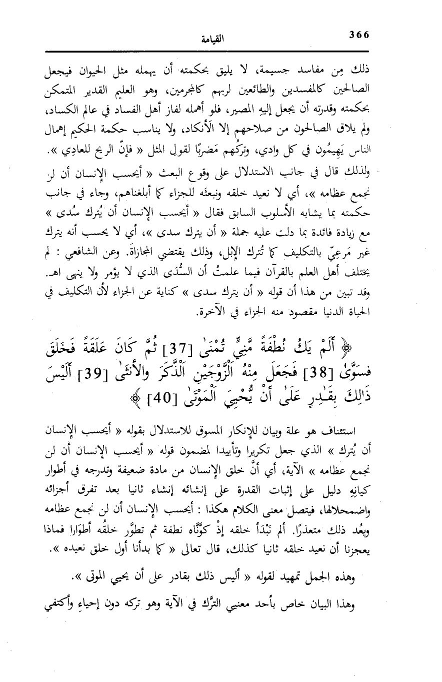 ذَلِكَ مِنْ مَفَاسِدَ جَسِيمَةٍ، لَا يَلِيقُ بِحِكْمَتِهِ أَنْ يُهْمِلَهُ مِثْلَ الْحَيَوَانِ فَيَجْعَلَ الصَّالِحِينَ كَالْمُفْسِدِينَ وَالطَّائِعِينَ لِرَبِّهِمْ كَالْمُجْرِمِينَ، وَهُوَ الْعَلِيمُ الْقَدِيرُ الْمُتَمَكِّنُ بِحِكْمَتِهِ وَقُدْرَتِهِ أَنْ يَجْعَلَ إِلَيْهِ الْمَصِيرَ، فَلَوْ أَهْمَلَهُ لَفَازَ أَهْلُ الْفَسَادِ فِي عَالَمِ الْكَسَادِ، وَلَمْ يُلَاقِ الصَّالِحُونَ مِنْ صَلَاحِهِمْ إِلَّا الْأَنْكَادَ، وَلَا يُنَاسِبُ حِكْمَةَ الْحَكِيمِ إِهْمَالُ النَّاسِ يَهِيمُونَ فِي كل وَادي، وَتَرْكُهُمْ مَضْرِبًا لِقَوْلِ الْمَثَلِ «فَإِنَّ الرِّيحَ لِلْعَادِي» .