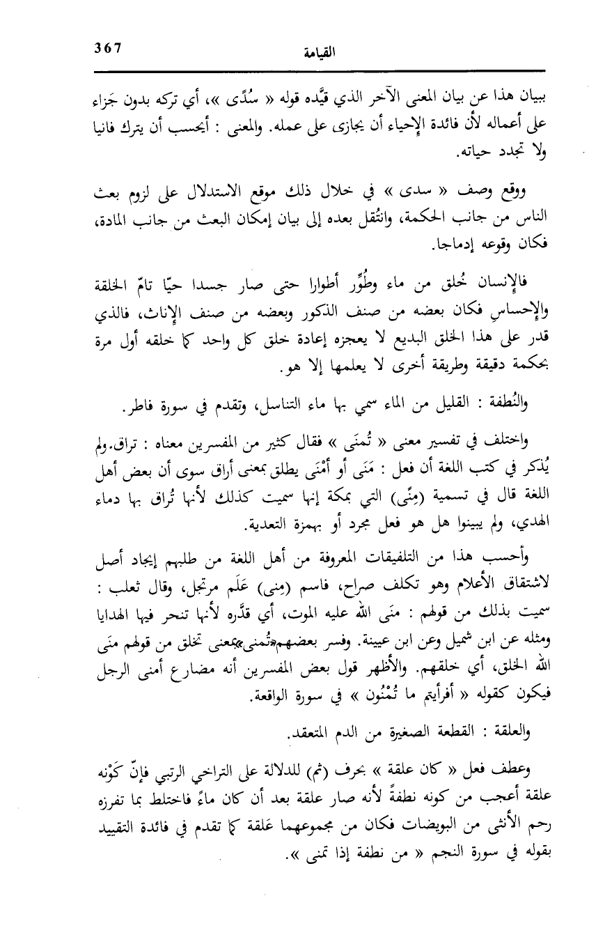 وَاخْتُلِفَ فِي تَفْسِير معنى يُمْنى فَقَالَ كَثِيرٌ مِنَ الْمُفَسِّرِينَ مَعْنَاهُ: تُرَاقُ. وَلَمْ يُذْكَرْ فِي كُتُبِ اللُّغَةِ أَنَّ فِعْلَ: مَنَى أَوْ أَمْنَى يُطْلَقُ بِمَعْنَى أَرَاقَ سِوَى أَنَّ بَعْضَ أَهْلِ اللُّغَةِ قَالَ فِي تَسْمِيَةِ (مِنَى) الَّتِي بِمَكَّةَ إِنَّهَا سُمِّيَتْ كَذَلِكَ لِأَنَّهَا تُرَاقُ بِهَا دِمَاءُ الْهَدْيِ، وَلَمْ يُبَيِّنُوا هَلْ هُوَ فِعْلٌ مُجَرَّدٌ أَوْ بِهَمْزَةِ التَّعْدِيَةِ.