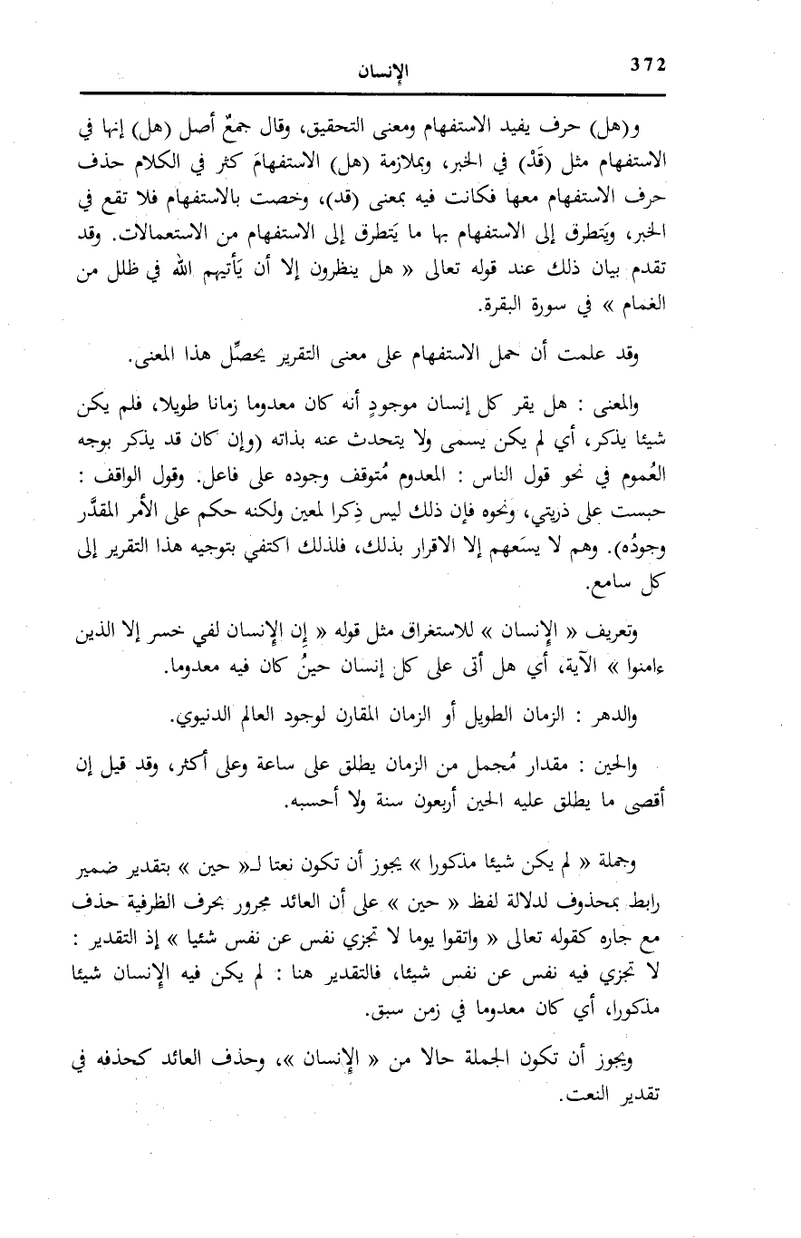 وَالْمَعْنَى: هَلْ يُقِرُّ كُلُّ إِنْسَانٍ مَوْجُودٍ أَنَّهُ كَانَ مَعْدُومًا زَمَانًا طَوِيلًا، فَلَمْ يَكُنْ شَيْئًا يُذْكَرُ، أَيْ لَمْ يَكُنْ يُسَمَّى وَلَا يَتَحَدَّثُ عَنْهُ بِذَاتِهِ (وَإِنْ كَانَ قَدْ يُذْكَرُ بِوَجْهِ الْعُمُومِ فِي نَحْوِ قَوْلِ النَّاسِ: الْمَعْدُومُ مُتَوَقِّفٌ وُجُودُهُ عَلَى فَاعِلٍ. وَقَوْلُ الْوَاقِفِ: حُبِسْتُ عَلَى ذُرِّيَّتِي، وَنَحْوَهُ فَإِنَّ ذَلِكَ لَيْسَ ذِكْرًا لِمُعَيَّنٍ وَلَكِنَّهُ حُكْمٌ عَلَى الْأَمْرِ الْمُقَدَّرِ وَجُودُهُ) . وَهُمْ لَا يَسَعُهُمْ إِلَّا الْإِقْرَارُ بِذَلِكَ، فَلِذَلِكَ اكْتُفِيَ بِتَوْجِيهِ هَذَا التَّقْرِيرِ إِلَى كُلِّ سَامِعٍ.