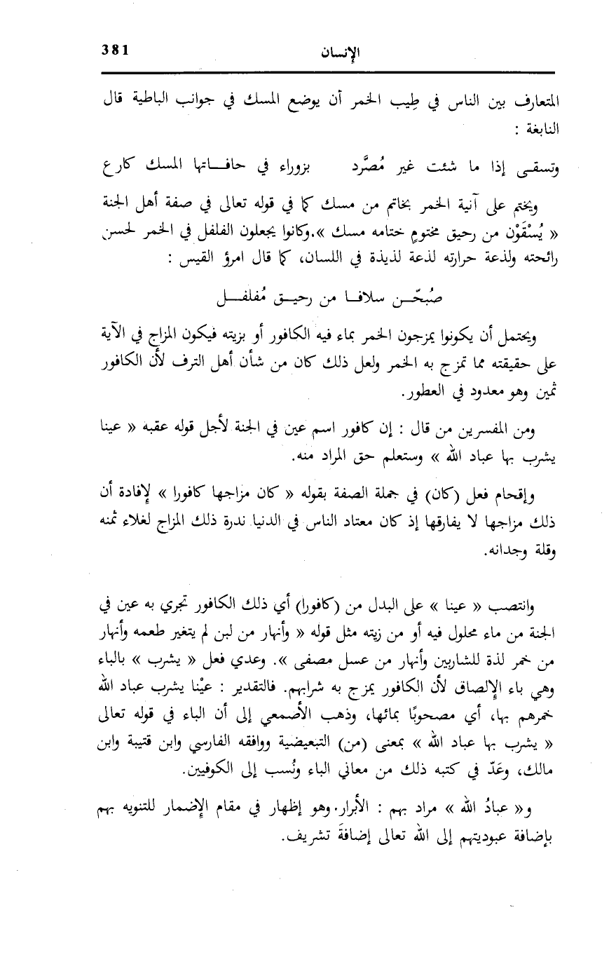 صُبِّحْنَ سُلَافًا مِنْ رَحِيقٍ مُفَلْفَلٍ وَيُحْتَمَلُ أَنْ يَكُونُوا يَمْزِجُونَ الْخَمْرَ بِمَاءٍ فِيهِ الْكَافُورُ أَوْ بِزَيْتِهِ فَيَكُونُ الْمِزَاجُ فِي الْآيَةِ
