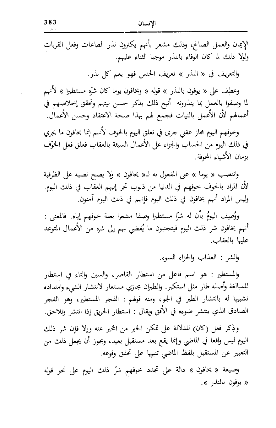 وَوُصِفَ الْيَوْمُ بِأَنَّ لَهُ شَرًّا مُسْتَطِيرًا وَصْفًا مُشْعِرًا بِعِلَّةِ خَوْفِهِمْ إِيَّاهُ. فَالْمَعْنَى: أَنَّهُمْ يَخَافُونَ شَرَّ ذَلِكَ الْيَوْمِ فَيَتَجَنَّبُونَ مَا يُفْضِي بِهِمْ إِلَى شَرِّهِ مِنَ الْأَعْمَالِ الْمُتَوَعَّدِ عَلَيْهَا بِالْعِقَابِ.