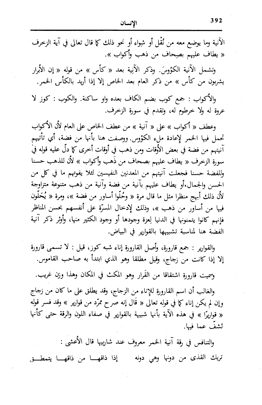 وَعَطْفُ أَكْوابٍ عَلَى (آنِيَةٍ) مِنْ عَطْفِ الْخَاصِّ عَلَى الْعَامِّ لِأَنَّ الْأَكْوَابَ تُحْمَلُ فِيهَا الْخَمْرُ لِإِعَادَةِ مَلْءِ الْكُؤُوسِ. وَوُصِفَتْ هُنَا بِأَنَّهَا مِنْ فِضَّةٍ، أَيْ تَأْتِيهِمْ آنِيَتُهُمْ مِنْ فِضَّةٍ فِي بَعْضِ الْأَوْقَاتِ وَمِنْ ذَهَبٍ فِي أَوْقَاتٍ أُخْرَى كَمَا دَلَّ عَلَيْهِ قَوْلُهُ فِي سُورَةِ الزُّخْرُفِ [71] يُطافُ عَلَيْهِمْ بِصِحافٍ مِنْ ذَهَبٍ وَأَكْوابٍ لِأَنَّ لِلذَّهَبِ حُسْنًا وَلِلْفِضَّةِ حُسْنًا فَجُعِلَتْ