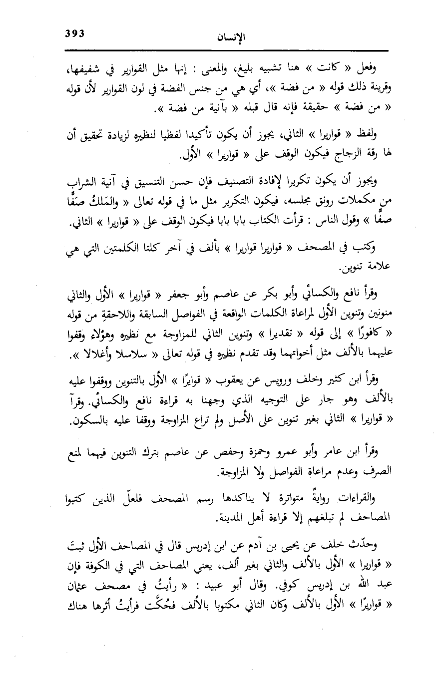 وَكُتِبَ فِي الْمُصْحَفِ قَوارِيرَا قَوارِيرَا بِأَلِفٍ فِي آخِرِ كِلْتَا الْكَلِمَتَيْنِ الَّتِي هِيَ عَلَامَةُ تَنْوِينٍ.