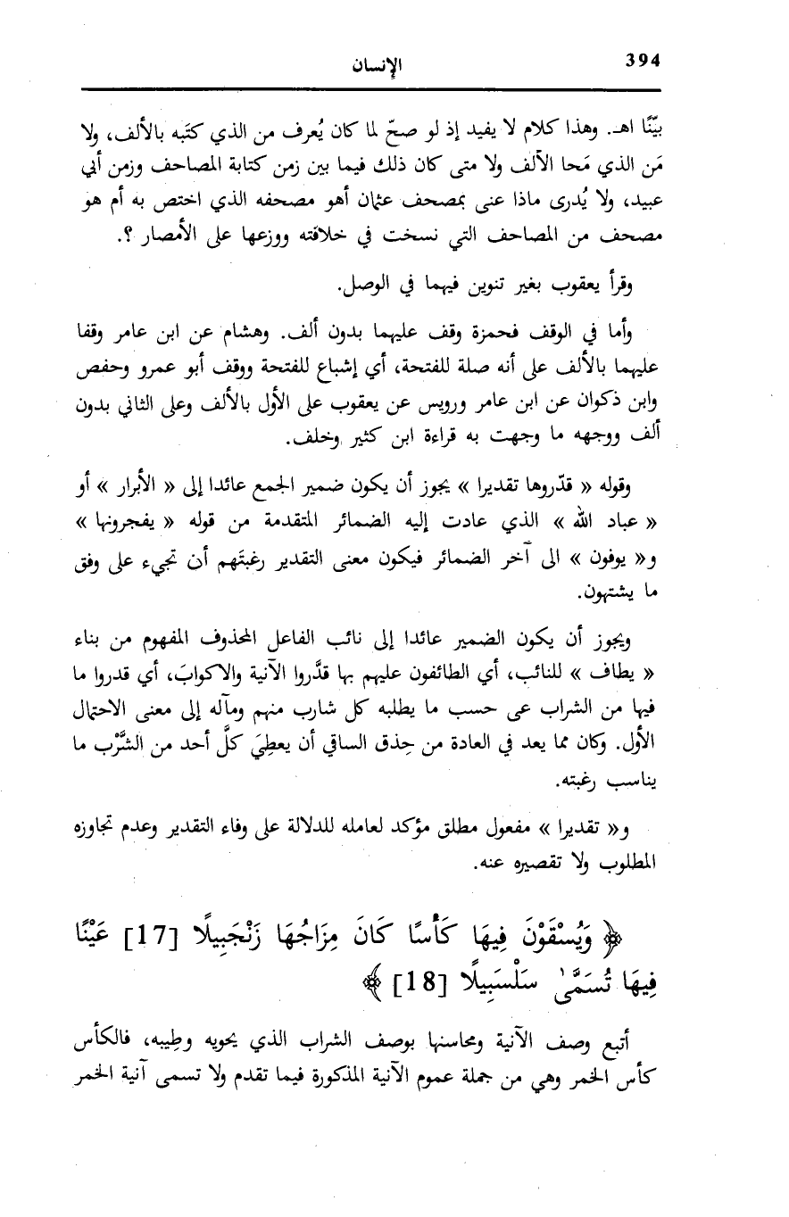 بَينا اهـ. وَهَذَا كَلَامٌ لَا يُفِيدُ إِذْ لَوْ صَحَّ لَمَا كَانَ يُعْرَفُ مَنِ الَّذِي كَتَبَهُ بِالْأَلِفِ، وَلَا مَنِ الَّذِي مَحَا الْأَلِفَ وَلَا مَتَى كَانَ ذَلِكَ فِيمَا بَيْنَ زَمَنِ كِتَابَةِ الْمَصَاحِفِ وَزَمَنِ أَبِي عُبَيْدٍ، وَلَا يُدْرَى مَاذَا عُنِي بِمُصْحَفِ عُثْمَانَ أَهْوَ مُصْحَفُهُ الَّذِي اخْتَصَّ بِهِ أَمْ هُوَ مُصْحَفٌ مِنَ الْمَصَاحِفِ الَّتِي نُسِخَتْ فِي خِلَافَتِهِ وَوَزَّعَهَا عَلَى الْأَمْصَارِ؟.