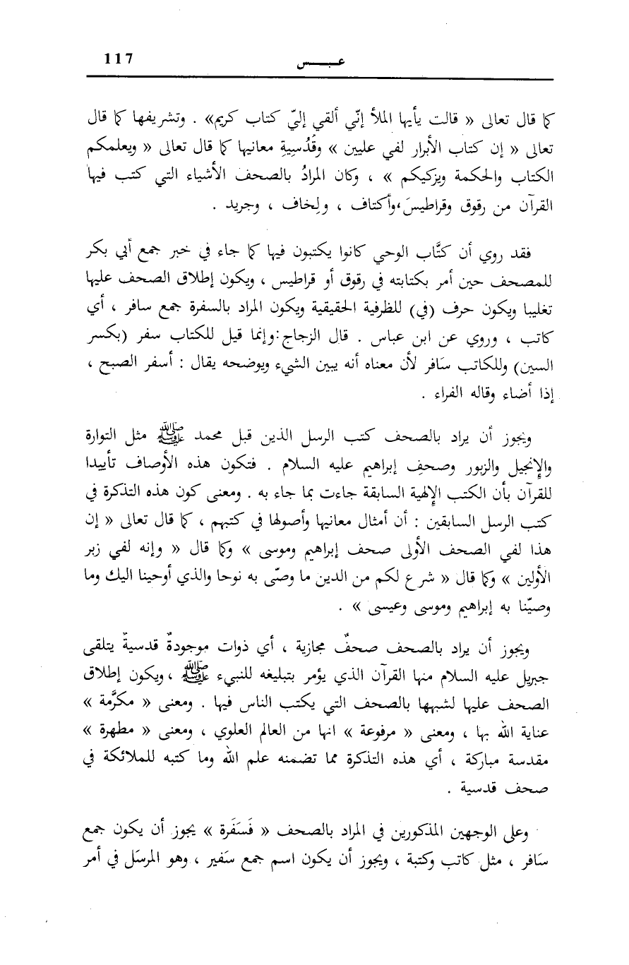 وَعَلَى الْوَجْهَيْنِ الْمَذْكُورَيْنِ فِي الْمُرَادِ بِالصُّحُفِ (فَسَفَرَةٌ) يَجُوزُ أَنْ يَكُونَ جَمْعَ سَافِرٍ، مِثْلَ كَاتِبٍ وَكَتَبَةٍ، وَيَجُوزُ أَنْ يَكُونَ اسْمَ جَمْعِ سَفِيرٍ، وَهُوَ الْمُرْسَلُ فِي أَمْرٍ