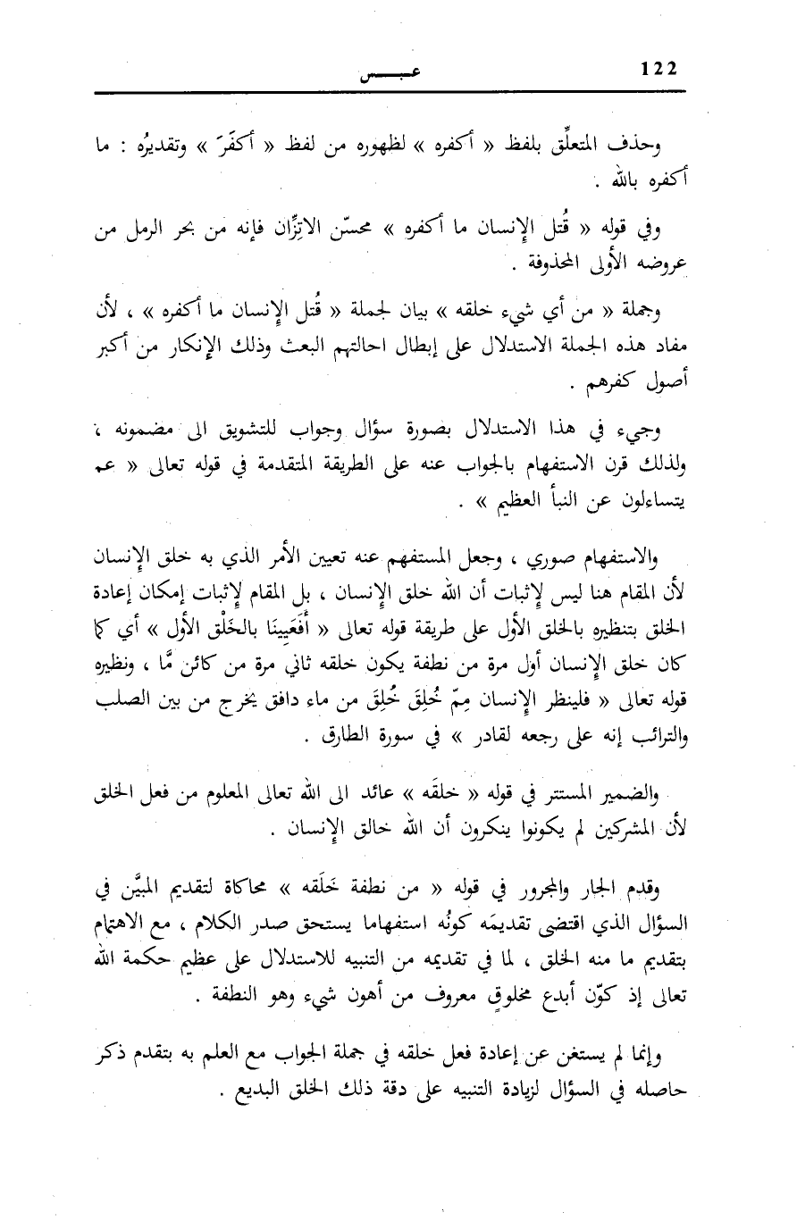 وَجُمْلَةُ مِنْ أَيِّ شَيْءٍ خَلَقَهُ بَيَانٌ لِجُمْلَةِ قُتِلَ الْإِنْسانُ مَا أَكْفَرَهُ لِأَنَّ مَفَادَ هَذِهِ الْجُمْلَةِ الِاسْتِدْلَالُ عَلَى إِبْطَالِ إِحَالَتِهِمُ الْبَعْثَ وَذَلِكَ الْإِنْكَارُ مِنْ أَكْبَرِ أُصُولِ كُفْرِهِمْ.