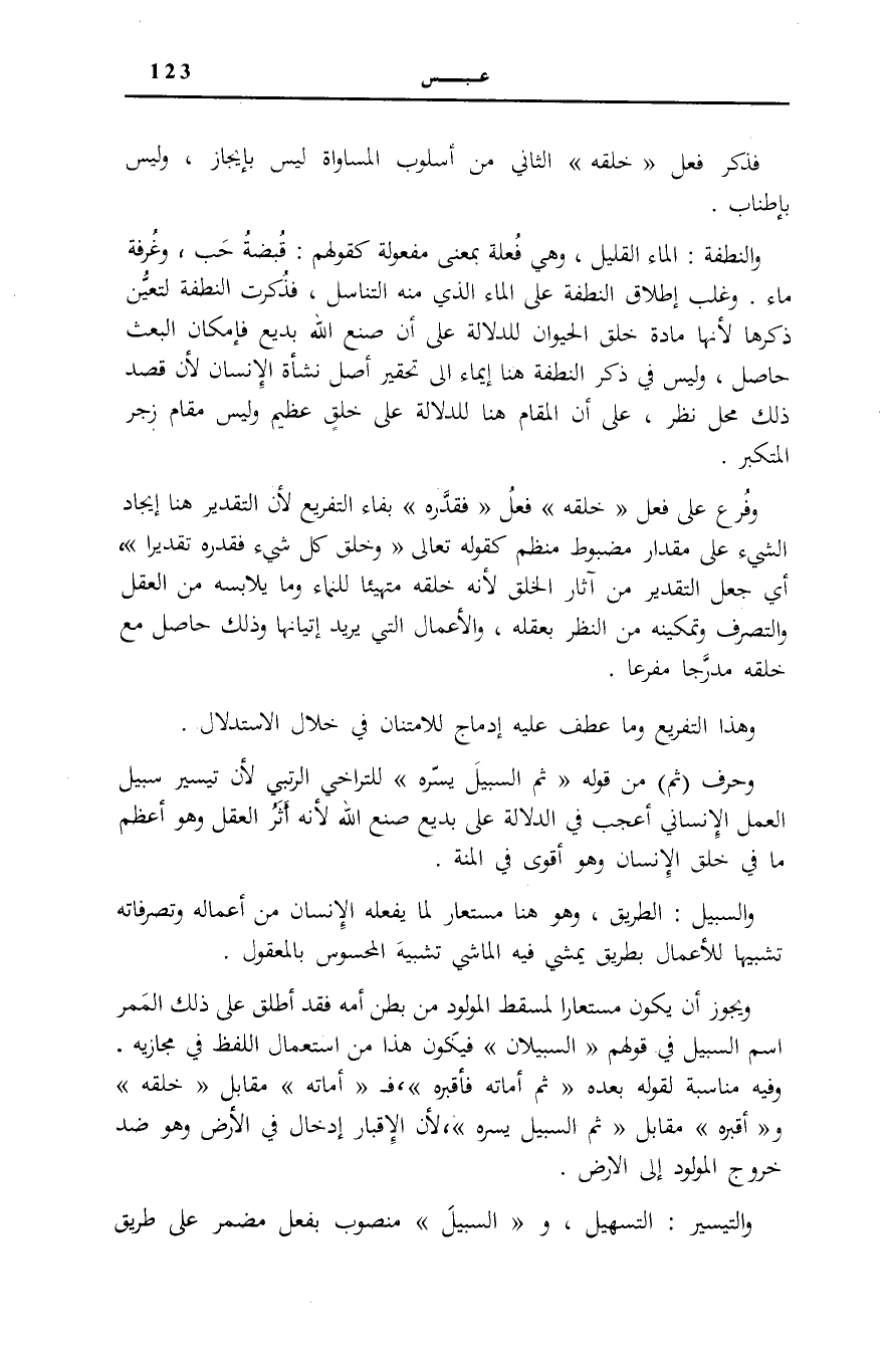 وَحَرْفُ ثُمَّ مِنْ قَوْلِهِ: ثُمَّ السَّبِيلَ يَسَّرَهُ لِلتَّرَاخِي الرُّتَبِيِّ لِأَنَّ تَيْسِيرَ سَبِيلِ الْعَمَلِ الْإِنْسَانِيِّ أَعْجَبُ فِي الدِّلَالَةِ عَلَى بَدِيعِ صُنْعِ اللَّهِ لِأَنَّهُ أَثَرُ الْعَقْلِ وَهُوَ أَعْظَمُ مَا فِي خَلْقِ الْإِنْسَانِ وَهُوَ أَقْوَى فِي الْمِنَّةِ.