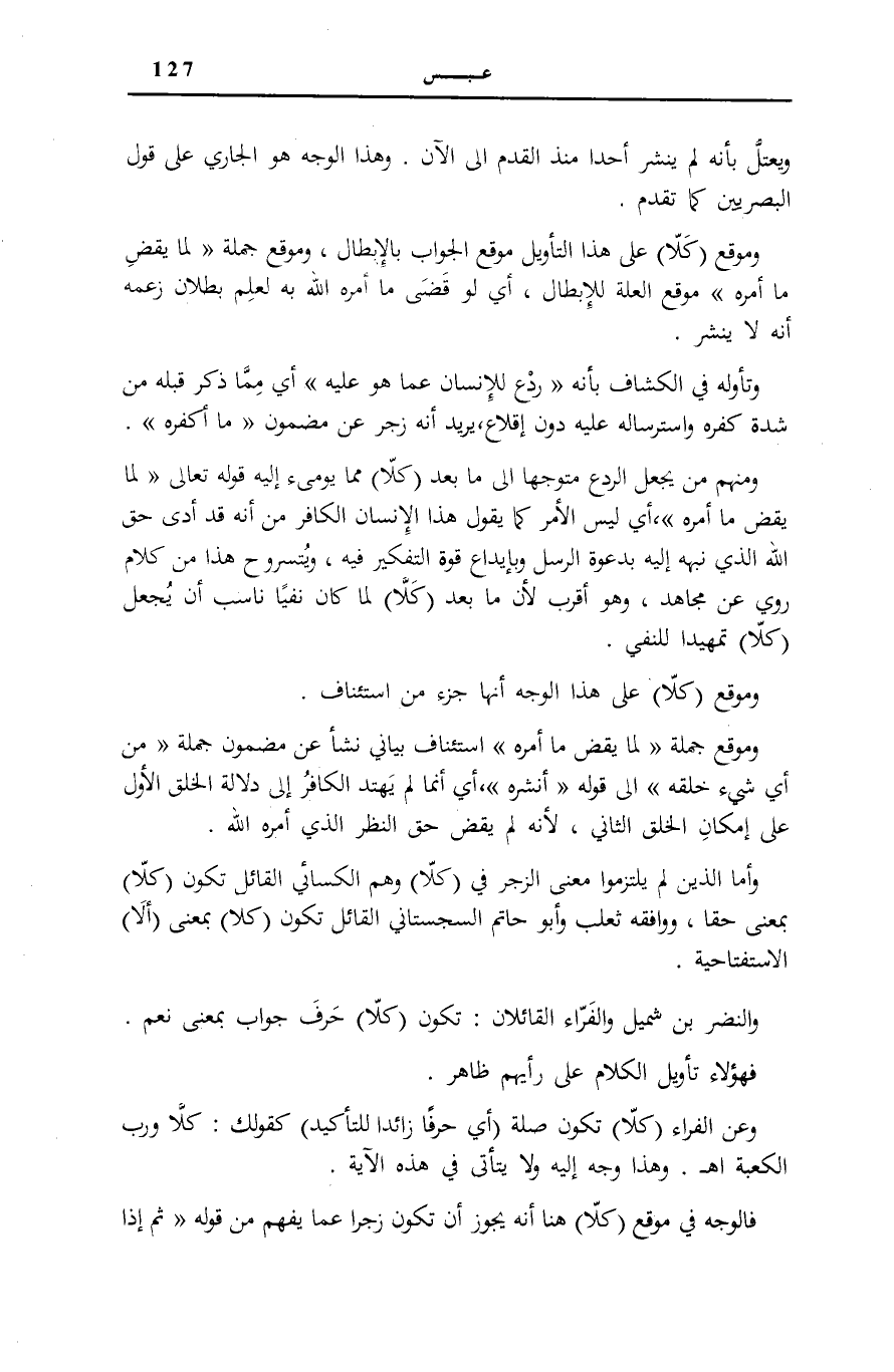 وَمَوْقِعُ كَلَّا عَلَى هَذَا التَّأْوِيلِ مَوْقِعُ الْجَوَابِ بِالْإِبْطَالِ، وَمَوْقِعُ جُمْلَةِ: لَمَّا يَقْضِ مَا أَمَرَهُ مَوْقِعُ الْعِلَّةِ لِلْإِبْطَالِ، أَيْ لَوْ قَضَى مَا أَمَرَهُ اللَّهُ بِهِ لَعَلِمَ بُطْلَانَ زَعْمِهِ أَنَّهُ لَا يُنْشَرُ.