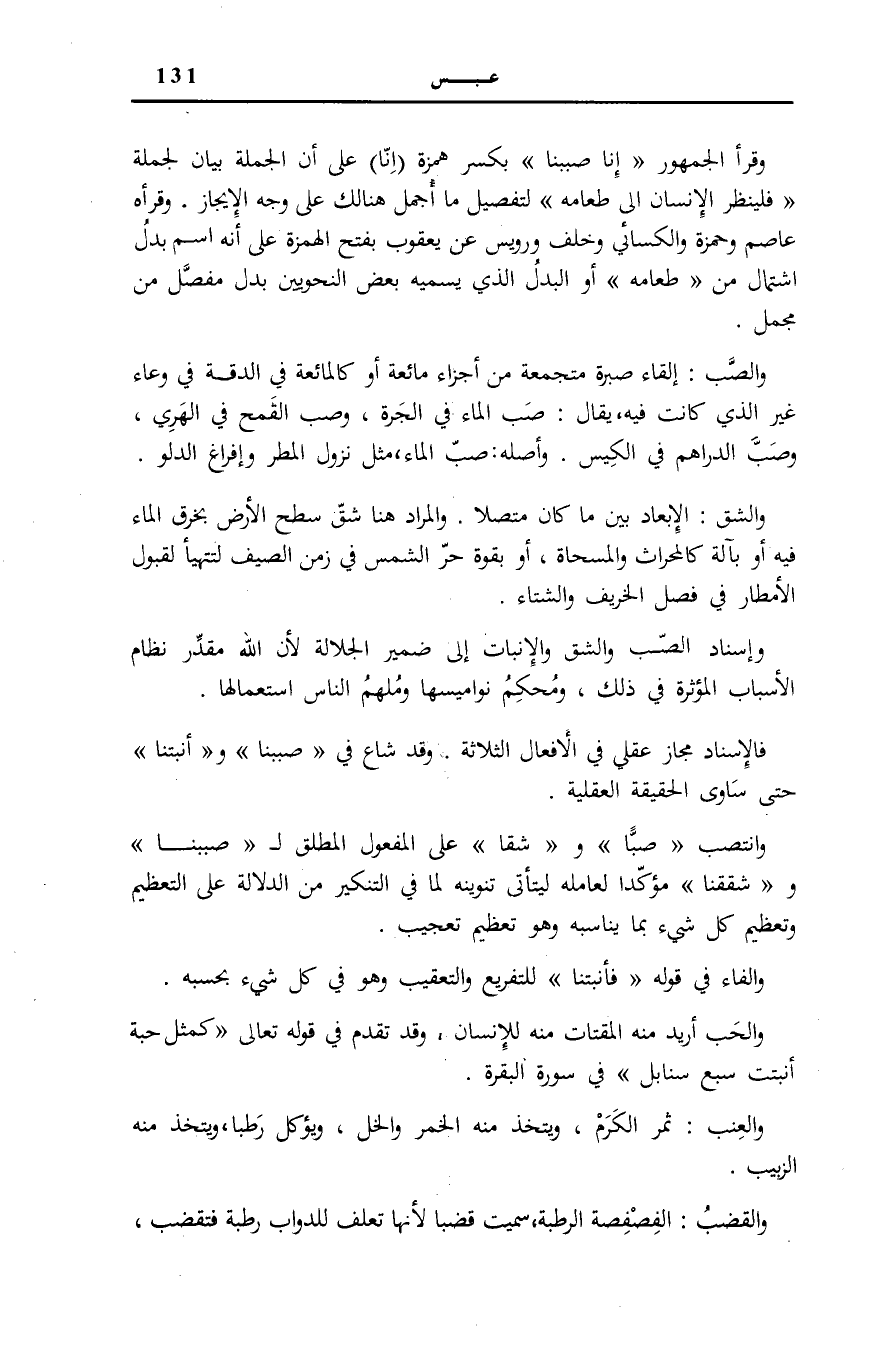 وَانْتَصَبَ صَبًّا وشَقًّا عَلَى الْمَفْعُولِ الْمُطْلَقِ لِ صَبَبْنَا وشَقَقْنَا مُؤَكِّدًا لِعَامِلِهِ لِيَتَأَتَّى تَنْوِينُهُ لِمَا فِي التَّنْكِيرِ مِنَ الدِّلَالَةِ عَلَى التَّعْظِيمِ وَتَعْظِيمُ كُلِّ شَيْءٍ بِمَا يُنَاسِبُهُ وَهُوَ تَعْظِيمُ تَعْجِيبٍ.