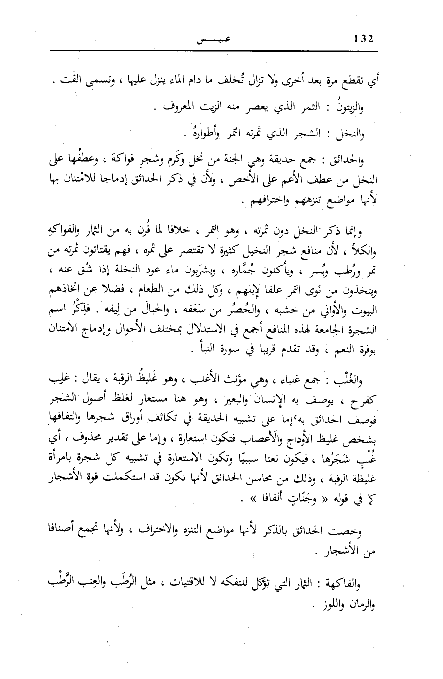 يُوصَفُ بِهِ الْإِنْسَانُ وَالْبَعِيرُ، وَهُوَ هُنَا مُسْتَعَارٌ لِغِلَظِ أُصُولِ الشَّجَرِ فَوَصْفُ الْحَدَائِقِ بِهِ إِمَّا عَلَى تَشْبِيهِ الْحَدِيقَةِ فِي تَكَاثُفِ أَوْرَاقِ شَجَرِهَا وَالْتِفَافِهَا بِشَخْصٍ غَلِيظِ الْأَوْدَاجِ وَالْأَعْصَابِ فَتَكُونُ اسْتِعَارَةً، وَإِمَّا عَلَى تَقْدِيرِ مَحْذُوفٍ، أَيْ غُلْبٌ شَجَرُهَا، فَيَكُونُ نَعْتًا سَبَبِيًّا وَتَكُونُ الِاسْتِعَارَةُ فِي تَشْبِيهِ كُلِّ شَجَرَةٍ بِامْرَأَةٍ غَلِيظَةِ الرَّقَبَةِ، وَذَلِكَ مِنْ مَحَاسِنِ الْحَدَائِقِ لِأَنَّهَا تَكُونُ قَدِ اسْتَكْمَلَتْ قُوَّةَ الْأَشْجَارِ كَمَا فِي قَوْلِهِ: وَجَنَّاتٍ أَلْفافاً [النبأ: 16] .