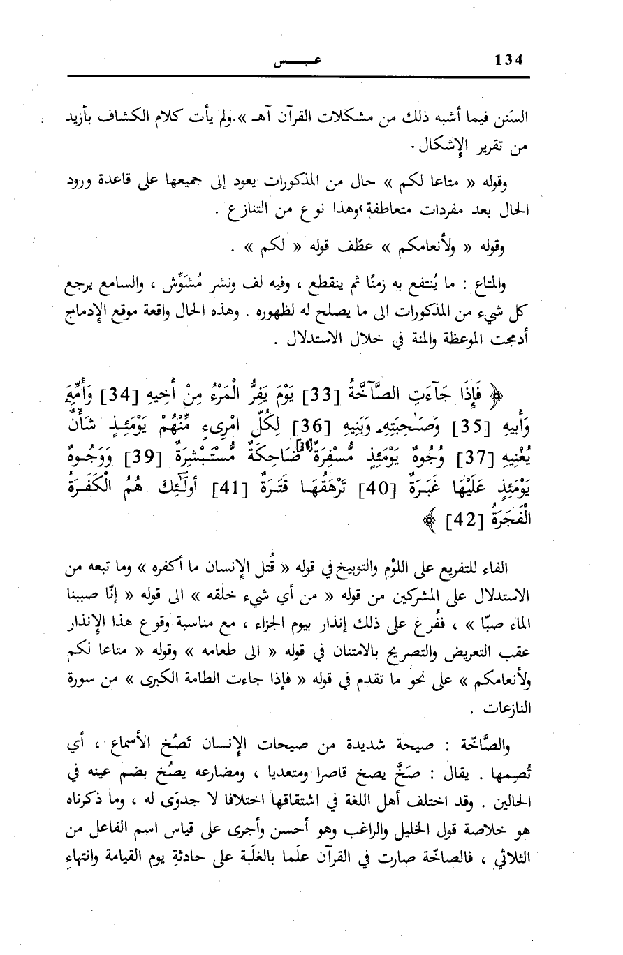 السَّنَنِ فِيمَا أَشْبَهَ ذَلِكَ مِنْ مُشْكِلَاتِ الْقُرْآنِ اهـ» . وَلَمْ يَأْتِ كَلَامُ «الْكَشَّافِ» بِأَزْيَدَ مِنْ تَقْرِيرِ الْإِشْكَالِ.