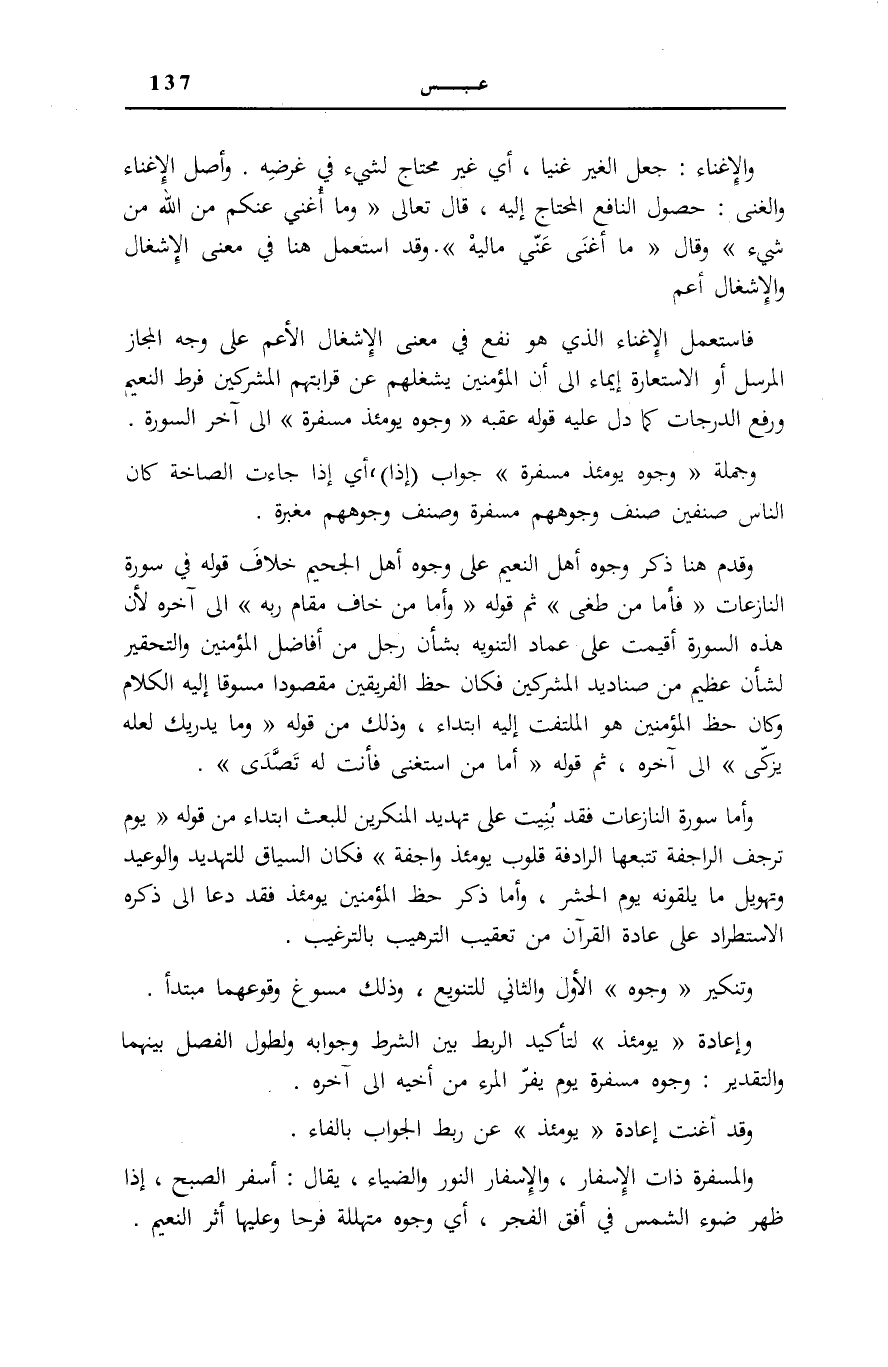 فَاسْتُعْمِلَ الْإِغْنَاءُ الَّذِي هُوَ نَفْعٌ فِي مَعْنَى الْإِشْغَالِ الْأَعَمِّ عَلَى وَجْهِ الْمَجَازِ الْمُرْسَلِ أَوِ الِاسْتِعَارَةِ إِيمَاءً إِلَى أَنَّ الْمُؤْمِنِينَ يَشْغَلُهُمْ عَنْ قَرَابَتِهِمُ الْمُشْرِكِينَ فَرْطُ النَّعِيمِ وَرَفْعُ الدَّرَجَاتِ كَمَا دَلَّ عَلَيْهِ قَوْلُهُ عَقِبَهُ: وُجُوهٌ يَوْمَئِذٍ مُسْفِرَةٌ إِلَى آخِرِ السُّورَةِ.