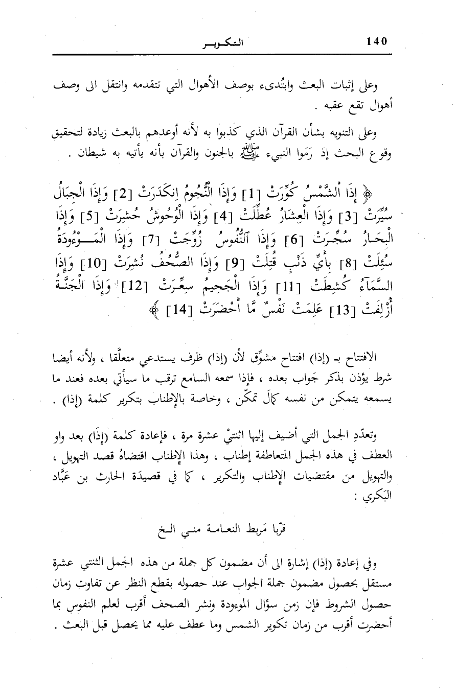 الِافْتِتَاحُ بِ إِذَا افْتِتَاحٌ مُشَوِّقٌ لِأَنَّ إِذَا ظَرْفٌ يَسْتَدْعِي مُتَعَلَّقًا، وَلِأَنَّهُ أَيْضًا شَرْطٌ يُؤْذِنُ بِذِكْرِ جَوَابٍ بَعْدَهُ، فَإِذَا سَمِعَهُ السَّامِعُ تَرَقَّبَ مَا سَيَأْتِي بعده فَعِنْدَ مَا يَسْمَعُهُ يَتَمَكَّنُ مِنْ نَفْسِهِ كَمَالَ تَمَكُّنٍ، وَخَاصَّةً بِالْإِطْنَابِ بِتَكْرِيرِ كَلِمَةِ إِذَا وَتَعَدُّدِ الْجُمَلِ الَّتِي أُضِيفَ إِلَيْهَا اثْنَتَيْ عَشْرَةَ مَرَّةً، فَإِعَادَةُ كَلِمَةِ إِذَا بَعْدَ وَاوِ الْعَطْفِ فِي هَذِهِ الْجُمَلِ الْمُتَعَاطِفَةِ إِطْنَابٌ، وَهَذَا الْإِطْنَابُ اقْتَضَاهُ قَصْدُ التَّهْوِيلِ، وَالتَّهْوِيلُ مِنْ مُقْتَضَيَاتِ الْإِطْنَابِ وَالتَّكْرِيرِ، كَمَا فِي قَصِيدَةِ الْحَارِثِ بْنِ عَبَّادٍ الْبَكْرِيِّ: