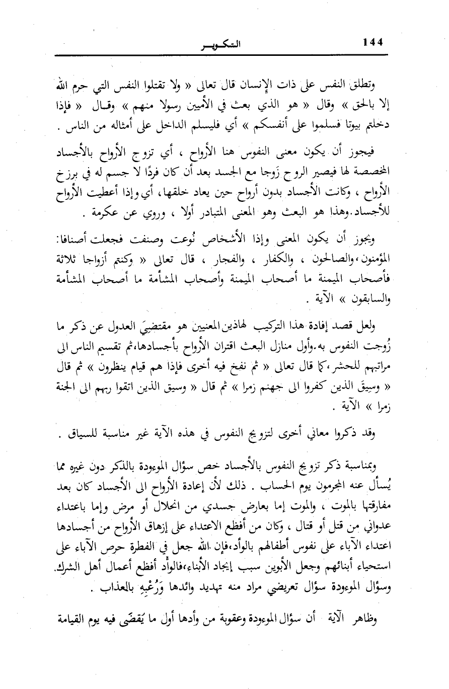 وَلَعَلَّ قَصْدَ إِفَادَةِ هَذَا التَّرْكِيبِ لِهَذَيْنِ الْمَعْنَيَيْنِ هُوَ مُقْتَضَى الْعُدُولِ عَنْ ذِكْرِ مَا زُوِّجَتِ النُّفُوسُ بِهِ. وَأَوَّلُ مَنَازِلِ الْبَعْثِ اقْتِرَانُ الْأَرْوَاحِ بِأَجْسَادِهَا، ثُمَّ تَقْسِيمُ النَّاسِ إِلَى مَرَاتِبِهِمْ لِلْحَشْرِ، كَمَا قَالَ تَعَالَى: ثُمَّ نُفِخَ فِيهِ أُخْرى فَإِذا هُمْ قِيامٌ يَنْظُرُونَ [الزمر: 68] ثُمَّ قَالَ: