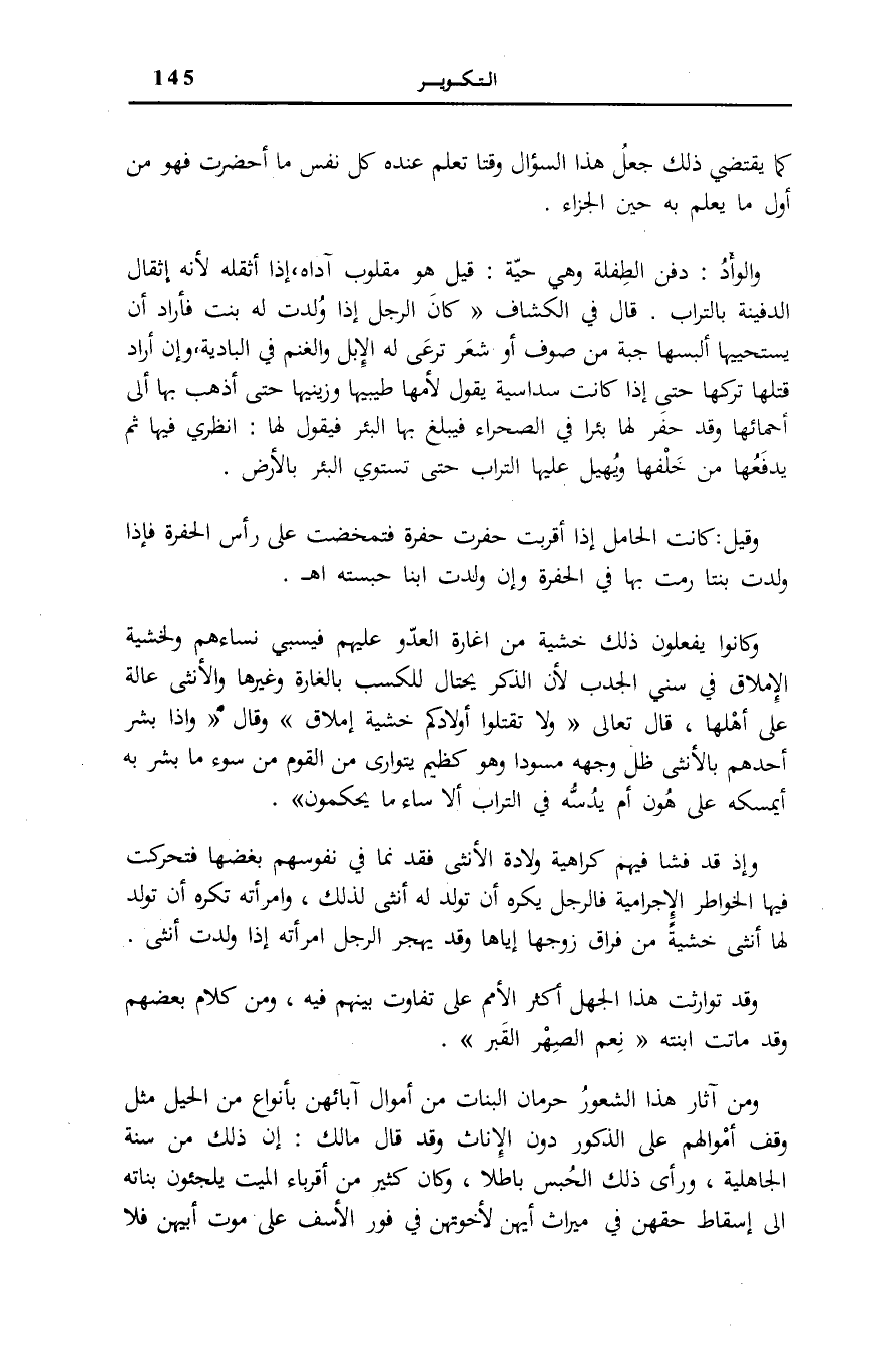 وَكَانُوا يَفْعَلُونَ ذَلِكَ خَشْيَةً مِنْ إِغَارَةِ الْعَدُوِّ عَلَيْهِمْ فَيَسْبِي نِسَاءَهُمْ وَلِخَشْيَةِ الْإِمْلَاقِ فِي سِنِيِّ الْجَدْبِ لِأَنَّ الذَّكَرَ يَحْتَالُ لِلْكَسْبِ بِالْغَارَةِ وَغَيْرِهَا وَالْأُنْثَى عَالَةٌ عَلَى أَهْلِهَا، قَالَ تَعَالَى: وَلا تَقْتُلُوا أَوْلادَكُمْ خَشْيَةَ إِمْلاقٍ [الْإِسْرَاء: 31] وَقَالَ: وَإِذا بُشِّرَ أَحَدُهُمْ بِالْأُنْثى