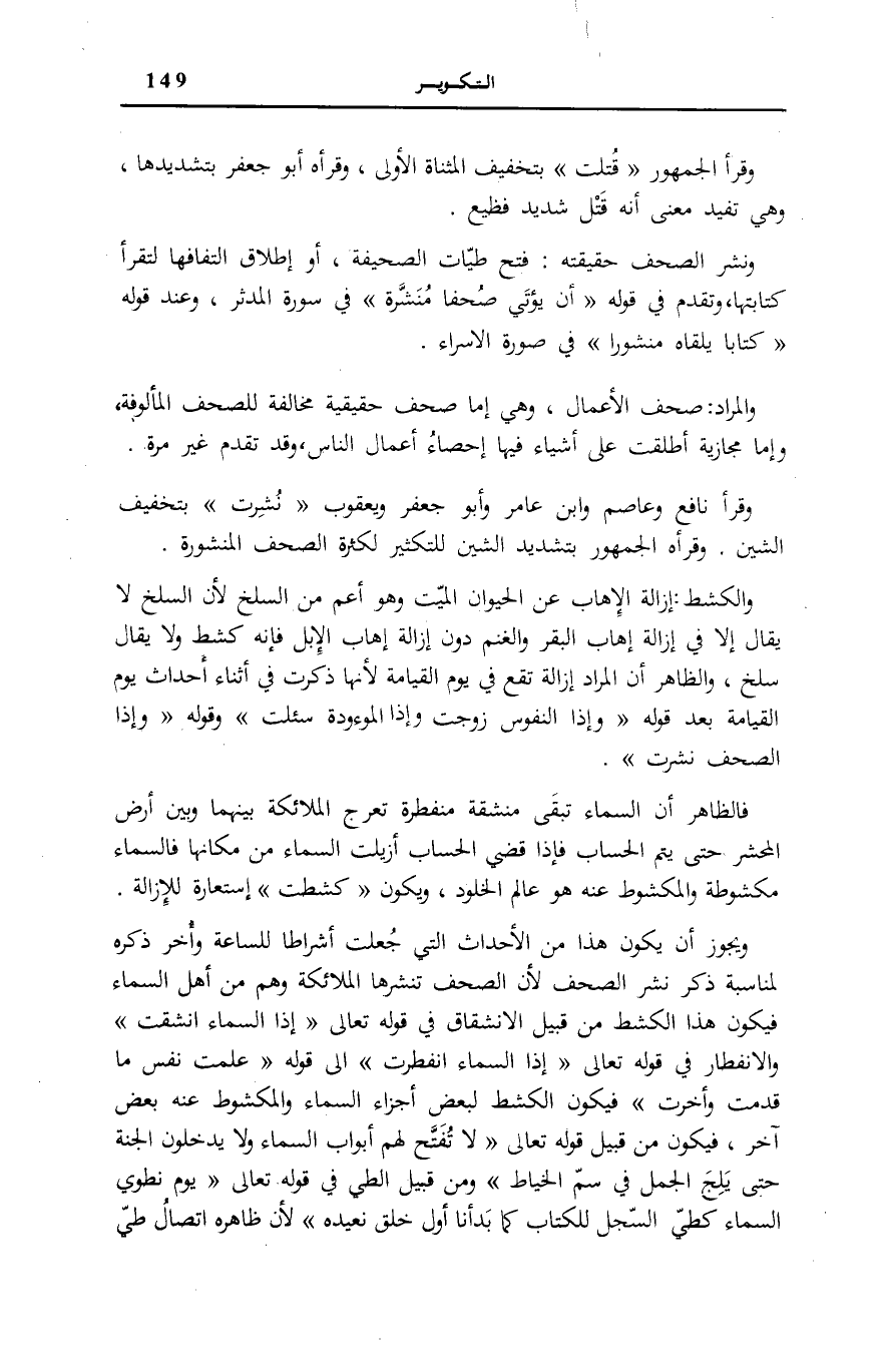 وَنَشْرُ الصُّحُفِ حَقِيقَتُهُ: فَتْحُ طَيَّاتِ الصَّحِيفَةِ، أَوْ إِطْلَاقُ الْتِفَافِهَا لِتُقْرَأَ كِتَابَتُهَا، وَتَقَدَّمَ فِي قَوْلِهِ: أَنْ يُؤْتى صُحُفاً مُنَشَّرَةً فِي سُورَةِ الْمُدَّثِّرِ [52] ، وَعِنْدَ قَوْلِهِ: كِتاباً يَلْقاهُ مَنْشُوراً فِي سُورَةِ الْإِسْرَاءِ [13] .