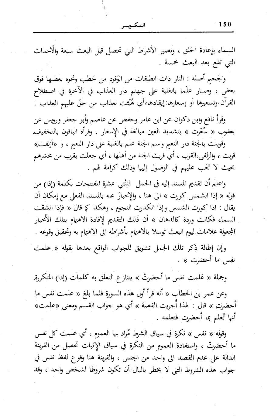 وَعَنْ عُمَرَ بْنِ الْخَطَّابِ: «أَنَّهُ قَرَأَ أَوَّلَ هَذِهِ السُّورَةِ فَلَمَّا بَلَغَ عَلِمَتْ نَفْسٌ مَا أَحْضَرَتْ قَالَ: لِهَذَا أُجْرِيَتِ الْقِصَّةُ» أَيْ هُوَ جَوَابُ الْقَسَمِ وَمَعْنَى عَلِمَتْ أَنَّهَا تُعْلَمُ بِمَا أَحْضَرَتْ فَتَعْلَمُهُ.