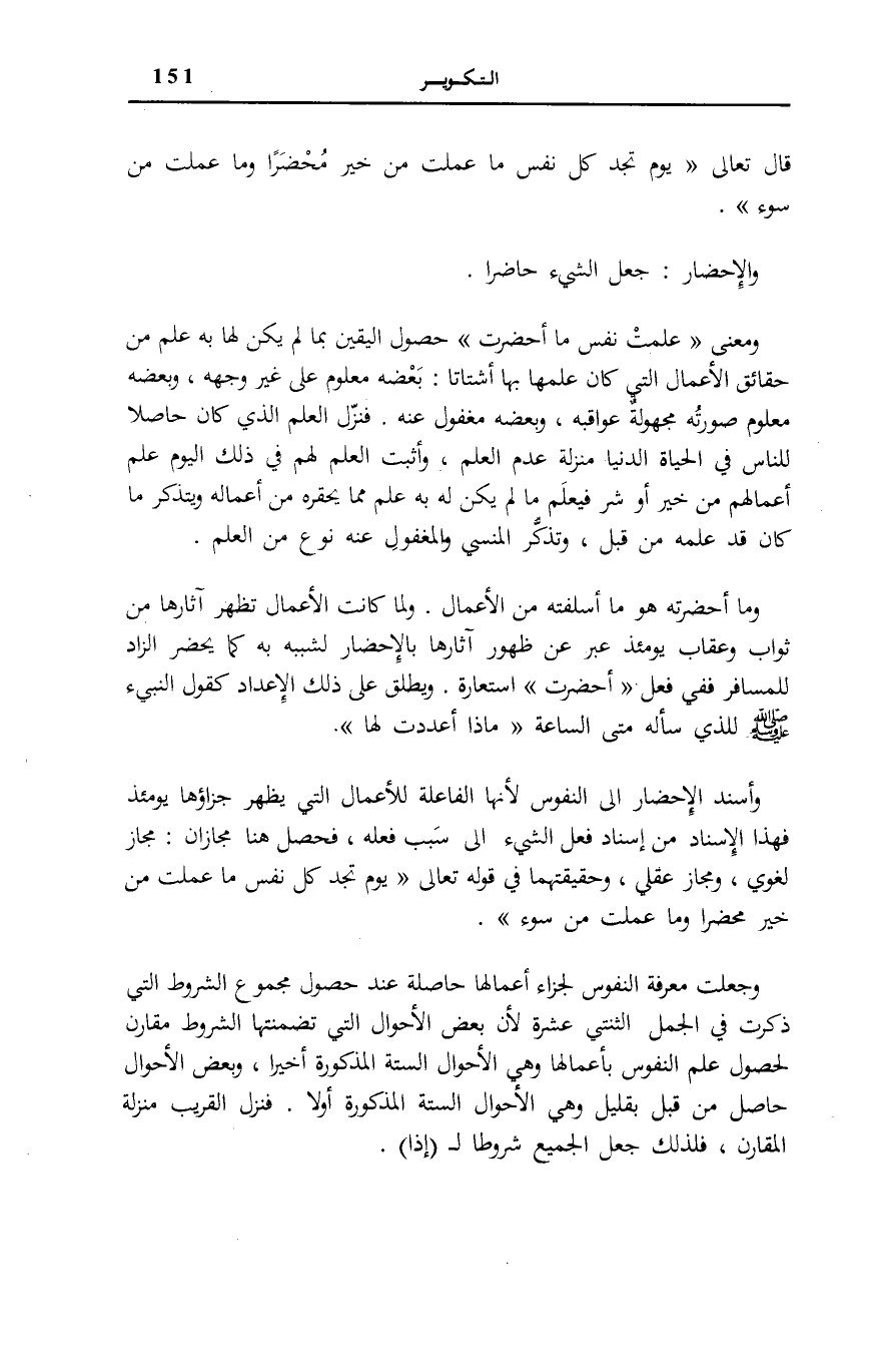 . وَأُسْنِدَ الْإِحْضَارُ إِلَى النُّفُوسِ لِأَنَّهَا الْفَاعِلَةُ لِلْأَعْمَالِ الَّتِي يَظْهَرُ جَزَاؤُهَا يَوْمَئِذٍ فَهَذَا الْإِسْنَادُ مِنْ إِسْنَادِ فِعْلِ الشَّيْءِ إِلَى سَبَبِ فِعْلِهِ، فَحَصَلَ هُنَا مَجَازَانِ: مَجَازٌ لُغَوِيٌّ، وَمَجَازٌ عَقْلِيٌّ، وَحَقِيقَتُهُمَا فِي قَوْلِهِ تَعَالَى: يَوْمَ تَجِدُ كُلُّ نَفْسٍ مَا عَمِلَتْ مِنْ خَيْرٍ مُحْضَراً وَما عَمِلَتْ مِنْ سُوءٍ وَجُعِلَتْ مَعْرِفَةُ النُّفُوسِ لِجَزَاءِ أَعْمَالِهَا حَاصِلَةً عِنْدَ حُصُولِ مَجْمُوعِ الشُّرُوطِ الَّتِي ذُكِرَتْ فِي الْجُمَلِ الثِّنْتَيْ عَشْرَةَ لِأَنَّ بَعْضَ الْأَحْوَالِ الَّتِي تَضَمَّنَتْهَا الشُّرُوطُ مُقَارَنٌ لِحُصُولِ عِلْمِ النُّفُوسِ بِأَعْمَالِهَا وَهِيَ الْأَحْوَالُ السِّتَّةُ الْمَذْكُورَةُ أَخِيرًا، وَبَعْضَ الْأَحْوَالِ حَاصِلٌ مِنْ قَبْلُ بِقَلِيلٍ وَهِيَ الْأَحْوَالُ السِّتَّةُ الْمَذْكُورَةُ أَوَّلًا. فَنَزَلَ الْقَرِيبُ مَنْزِلَةَ الْمُقَارَنِ، فَلِذَلِكَ جُعِلَ الْجَمِيعُ شُرُوطًا ل إِذَا