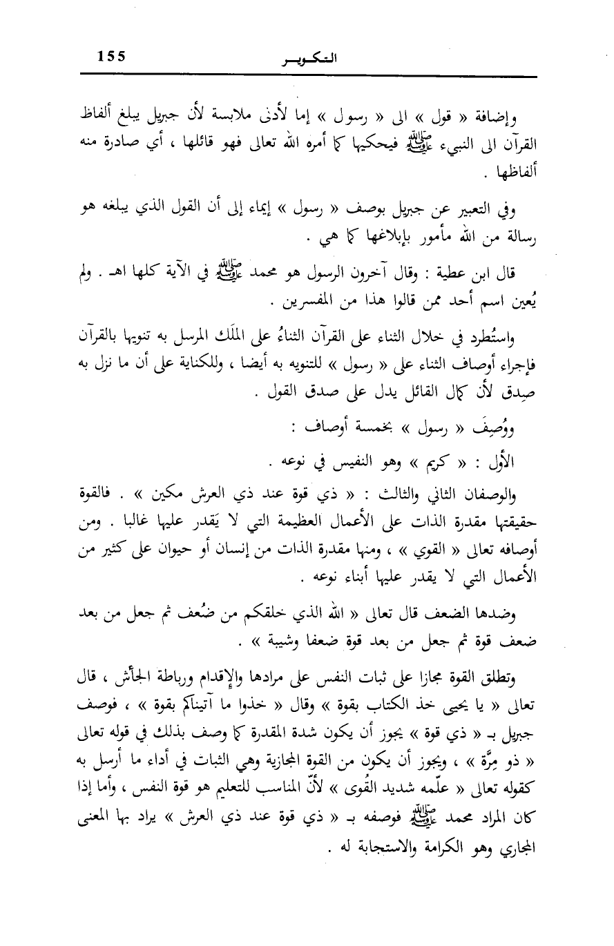 ذُو مِرَّةٍ [النَّجْم: 6] ، وَيَجُوزُ أَنْ يكون فِي الْقُوَّةِ الْمَجَازِيَّةِ وَهِيَ الثَّبَاتُ فِي أَدَاءِ مَا أُرْسِلَ بِهِ كَقَوْلِهِ تَعَالَى: عَلَّمَهُ شَدِيدُ الْقُوى [النَّجْم: 5] لِأَنَّ الْمُنَاسِبَ لِلتَّعْلِيمِ هُوَ قُوَّةُ النَّفْسِ، وَأَمَّا إِذَا كَانَ المُرَاد مُحَمَّد صَلَّى اللهُ عَلَيْهِ وَسَلَّمَ فَوَصْفُهُ بِ ذِي قُوَّةٍ عِنْدَ ذِي الْعَرْشِ يُرَادُ بِهَا الْمَعْنَى الْمَجَازِيُّ وَهُوَ الْكَرَامَةُ وَالِاسْتِجَابَةُ لَهُ.