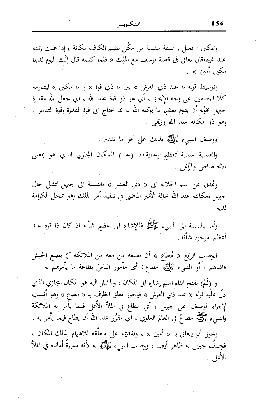 دَلَّ عَلَيْهِ قَوْلُهُ: عِنْدَ ذِي الْعَرْشِ فَيَجُوزُ تَعَلُّقُ الظَّرْفِ بِ مُطاعٍ وَهُوَ أَنْسَبُ لِإِجْرَاءِ الْوَصْفِ عَلَى جِبْرِيلَ، أَيْ مُطَاعٌ فِي الْمَلَأِ الْأَعْلَى فِيمَا يَأْمُرُ بِهِ الْمَلَائِكَةَ وَالنَّبِيءُ صَلَّى اللهُ عَلَيْهِ وَسَلَّمَ مُطَاعٌ فِي الْعَالَمِ الْعُلْوِيِّ، أَيْ مُقَرَّرٌ عِنْدَ اللَّهِ أَنْ يُطَاعَ فِيمَا يَأْمُرُ بِهِ.