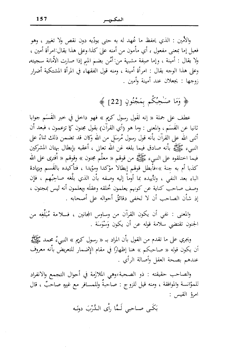 وَيَجْرِي عَلَى مَا تَقَدَّمَ مِنَ الْقَوْلِ بِأَنَّ الْمُرَادَ بِ رَسُولٍ كَرِيمٍ [التكوير: 19] النَّبِيءُ مُحَمَّدٌ صَلَّى اللهُ عَلَيْهِ وَسَلَّمَ أَنْ يَكُونَ قَوْلُهُ: صاحِبُكُمْ هُنَا إِظْهَارًا فِي مَقَامِ الْإِضْمَارِ لِلتَّعْرِيضِ بِأَنَّهُ مَعْرُوفٌ عِنْدَهُمْ بِصِحَّةِ الْعَقْلِ وَأَصَالَةِ الرَّأْيِ.