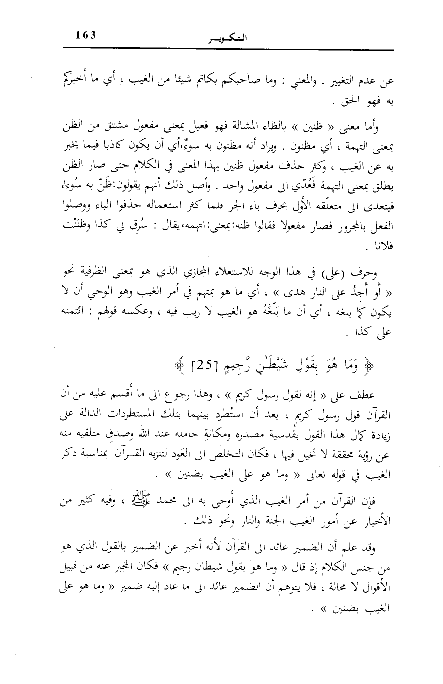 وَالْمَعْنَى: وَمَا صَاحِبُكُمْ بِكَاتِمٍ شَيْئًا مِنَ الْغَيْبِ، أَيْ مَا أَخْبَرَكُمْ بِهِ فَهُوَ الْحَقُّ.